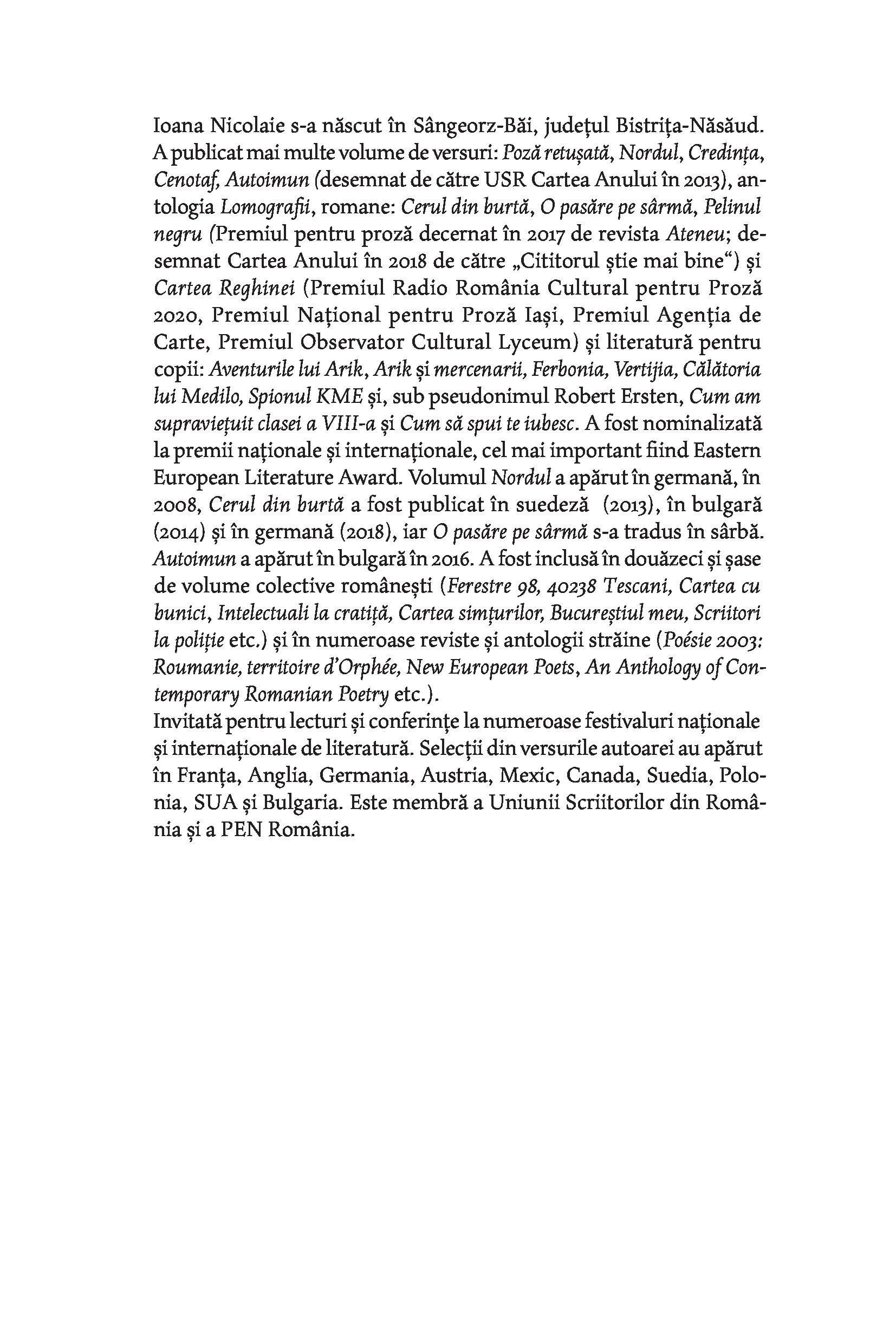 IOANA NICOLAIE este poetă și prozatoare. A câștigat numeroase premii literare. A publicat șase romane, cinci volume de versuri și unsprezece cărți pentru copii. Romanul Cartea Reghinei a fost în 2020 laureat al premiilor Radio România Cultural, Observator Lyceum, Premiul Național de Proză Iași și Premiul Agenția de Carte. Tot înainte a fost bestseller Humanitas în 2021 și, în 2022, finalist la Premiul PEN și la Premiile Seneca. Pelinul negru, primul roman din ceea ce critica a numit „trilogia nordului“, a primit Premiul pentru proză al revistei Ateneu. Miezul inimii a fost bestseller Humanitas. Cerul din burtă și O pasăre pe sârmă au avut și ele parte de aprecieri critice entuziaste. Cele cinci volume de versuri ale autoarei au atras, de asemenea, atenția juriilor literare, unele fiind recompensate cu premii, altele fiind traduse în germană, bulgară și suedeză. A publicat nouă cărți pentru copii cu numele ei și alte două cu pseudonimul Robert Ersten. A fost inclusă în treizeci și șase de volume colective românești și în numeroase reviste și antologii străine. Invitată pentru lecturi și conferințe la multe festivaluri naționale și internaționale de literatură. Este membră a Uniunii Scriitorilor din România și a PEN România.