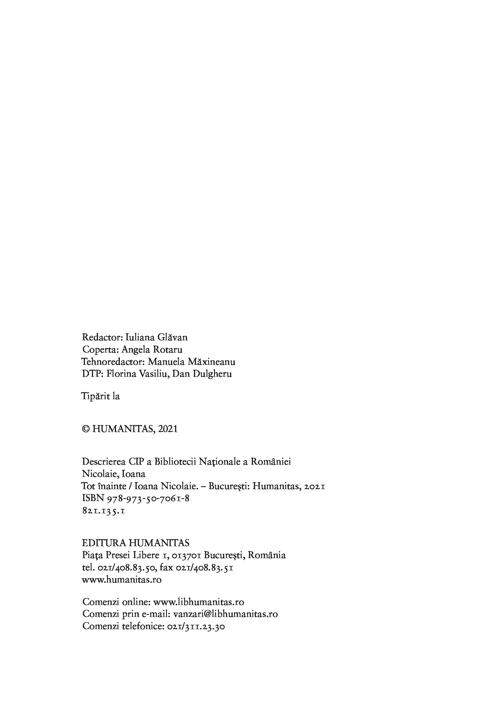Roman psihologic, empatic și bine dozat la nivelul emoției, desfășurat în același decor mitic și în același timp cât se poate de realist al unui orășel din Nord, Tot înainte este o mărturie puternică despre monstruozitatea comunismului românesc, care a frânt milioane de vieți, visuri și destine.