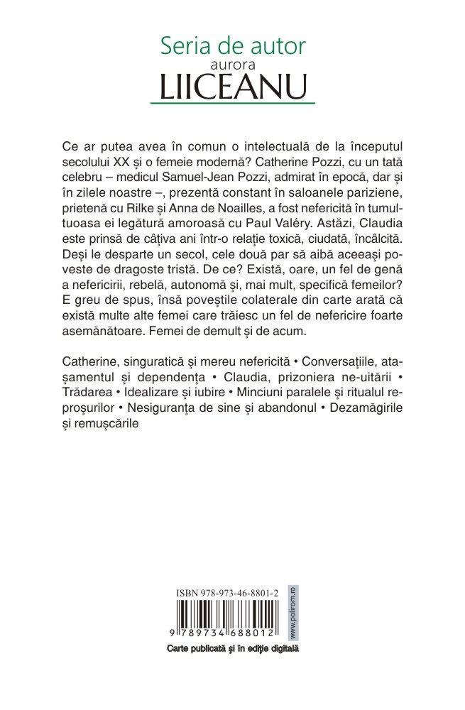 Ce ar putea avea în comun o intelectuală de la începutul secolului XX și o femeie modernă? Catherine Pozzi, cu un tată celebru – medicul Samuel-Jean Pozzi, admirat în epocă, dar și în zilele noastre –, prezentă constant în saloanele pariziene, prietenă cu Rilke și Anna de Noailles, a fost nefericită în tumultuoasa ei legătură amoroasă cu Paul Valéry. Astăzi, Claudia este prinsă de câțiva ani într-o relație toxică, ciudată, încâlcită. Deși le desparte un secol, cele două par să aibă aceeași poveste de dragoste tristă. De ce? Există, oare, un fel de genă a nefericirii, rebelă, autonomă și, mai mult, specifică femeilor? E greu de spus, însă poveștile colaterale din carte arată că există multe alte femei care trăiesc un fel de nefericire foarte asemănătoare. Femei de demult și de acum.