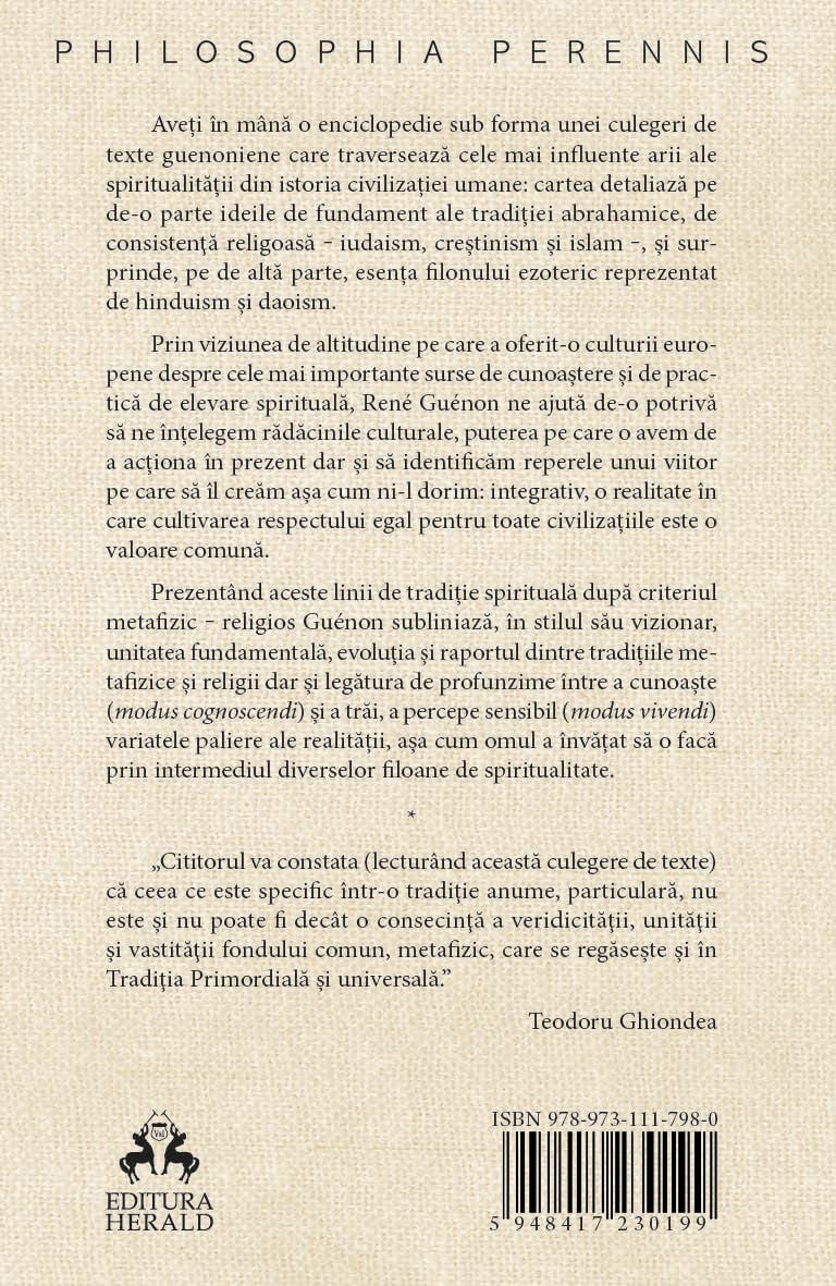 Aveti in mana o enciclopedie sub forma unei culegeri de texte guenoniene care traverseaza cele mai influente arii ale spiritualitatii din istoria civilizatiei umane: cartea detaliaza pe de-o parte ideile de fundament ale traditiei abrahamice, de consistenta religoasa ‒ iudaism, crestinism si islam ‒, si surprinde, pe de alta parte, esenta filonului ezoteric reprezentat de hinduism si daoism.