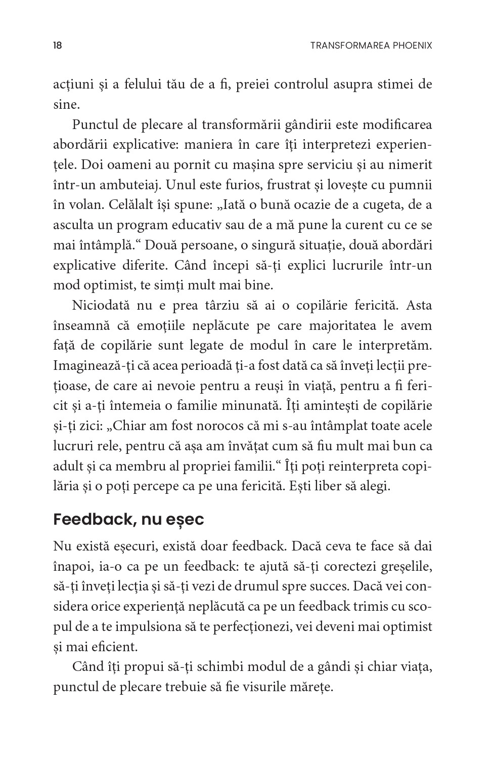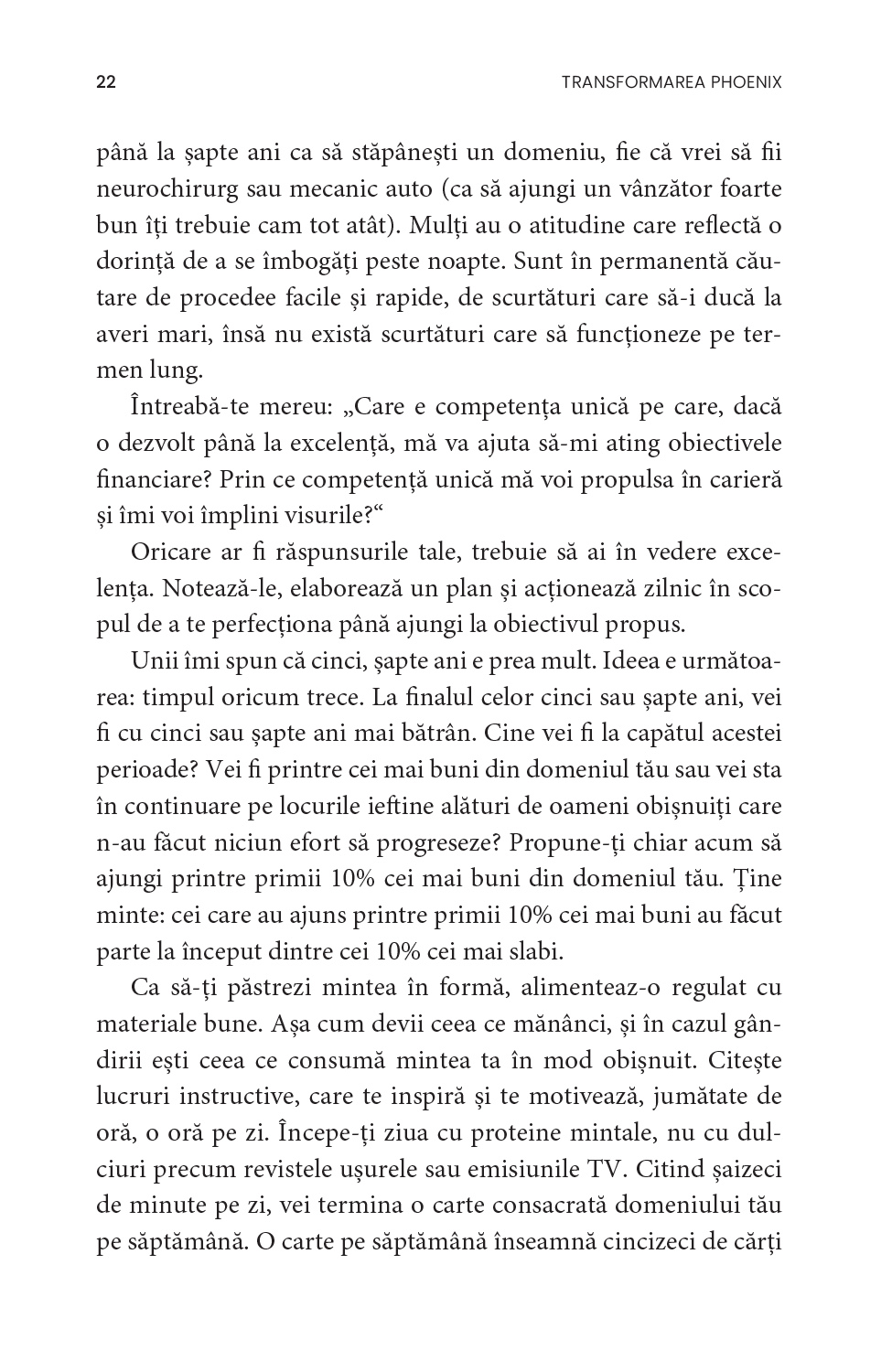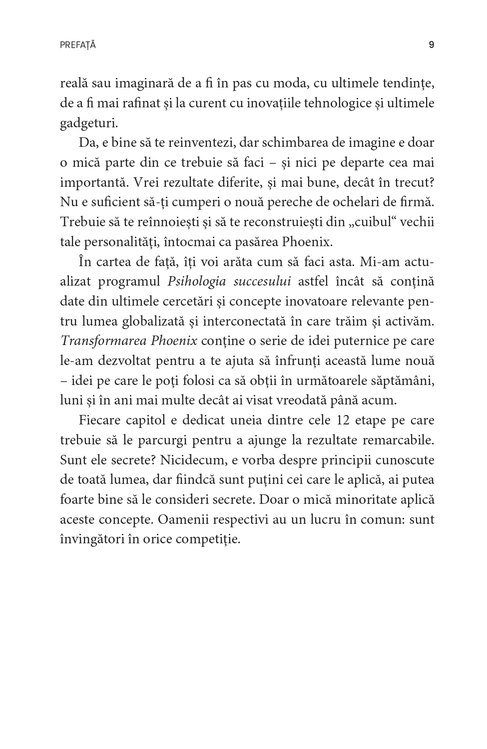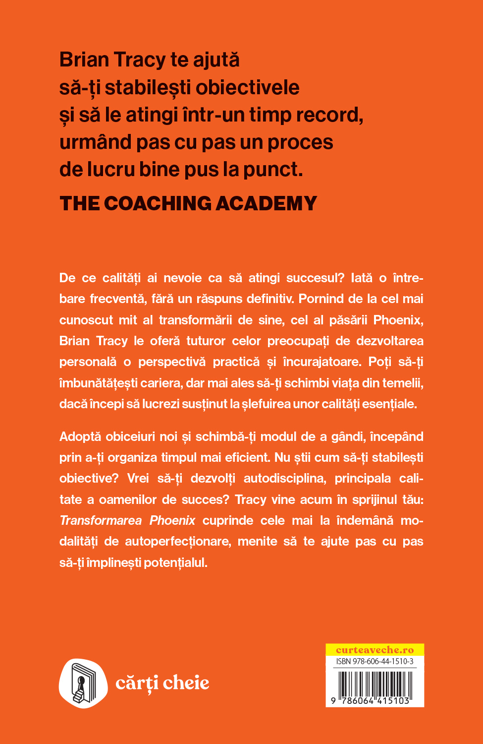 Adoptă obiceiuri noi și schimbă-ți modul de a gândi, începând prin a-ți organiza timpul mai eficient. Nu știi cum să-ți stabilești obiective? Vrei să-ți dezvolți autodisciplina, principala calitate a oamenilor de succes? Tracy vine acum în sprijinul tău: Transformarea Phoenix cuprinde cele mai la îndemână modalități de autoperfecționare, menite să te ajute pas cu pas să-ți împlinești potențialul.
