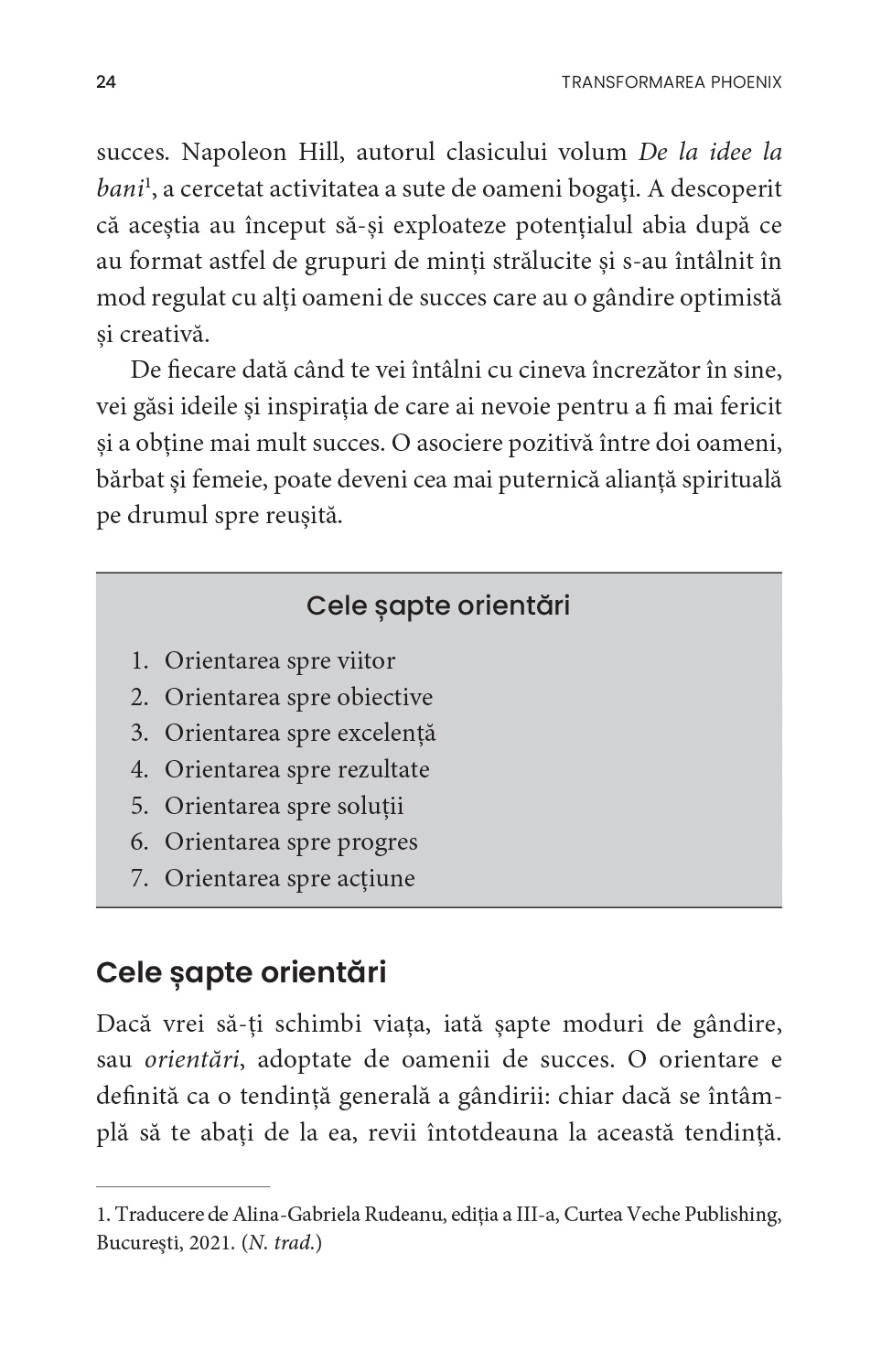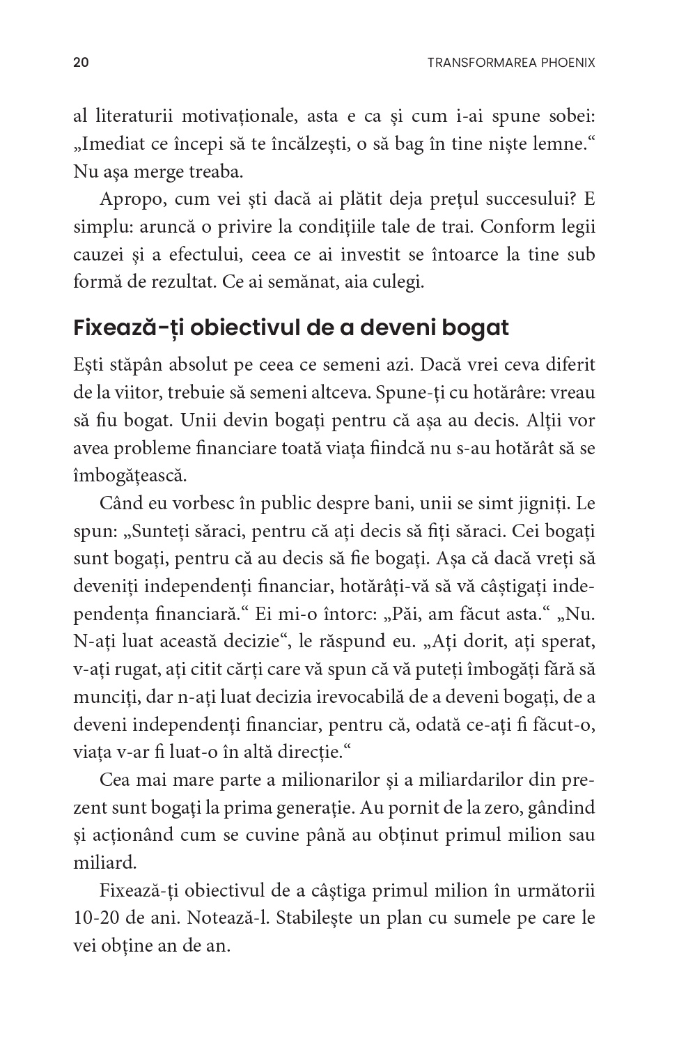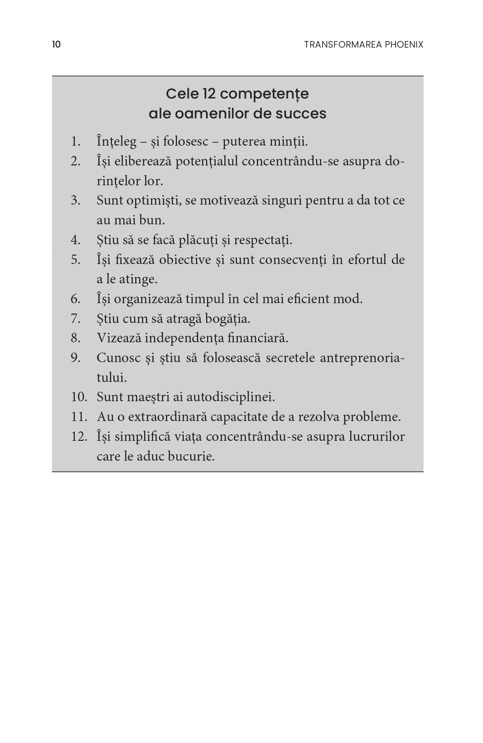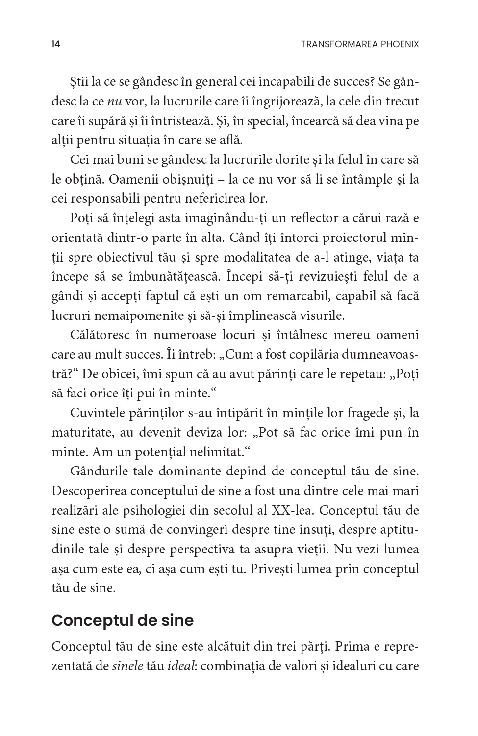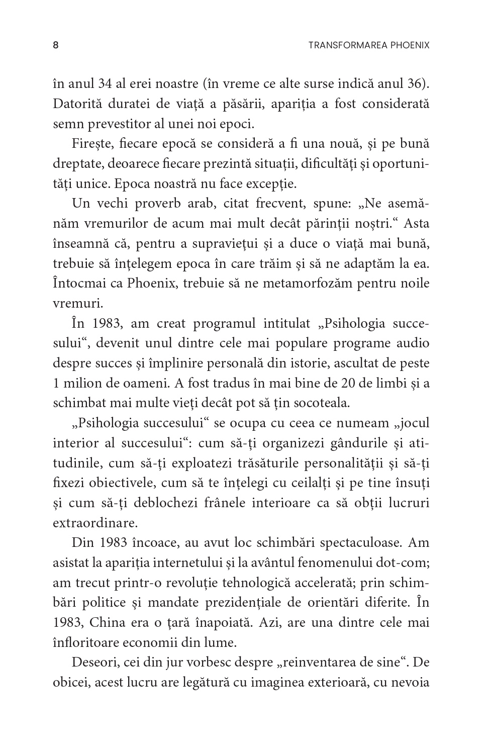 Adoptă obiceiuri noi și schimbă-ți modul de a gândi, începând prin a-ți organiza timpul mai eficient. Nu știi cum să-ți stabilești obiective? Vrei să-ți dezvolți autodisciplina, principala calitate a oamenilor de succes? Tracy vine acum în sprijinul tău: Transformarea Phoenix cuprinde cele mai la îndemână modalități de autoperfecționare, menite să te ajute pas cu pas să-ți împlinești potențialul.