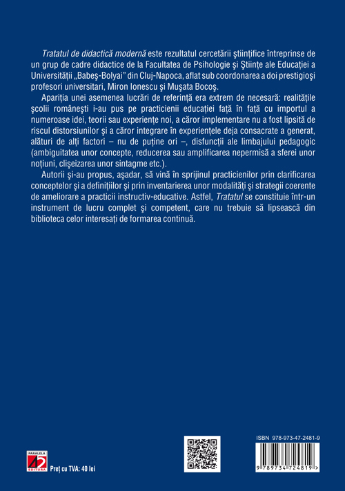 Tratatul de didactică modernă este rezultatul cercetării ştiinţifice întreprinse de un grup de cadre didactice de la Facultatea de Psihologie şi Ştiinţe ale Educaţiei a Universităţii „Babeş-Bolyai” din Cluj-Napoca, aflat sub coordonarea a doi prestigioşi profesori universitari, Miron Ionescu şi Muşata Bocoş.