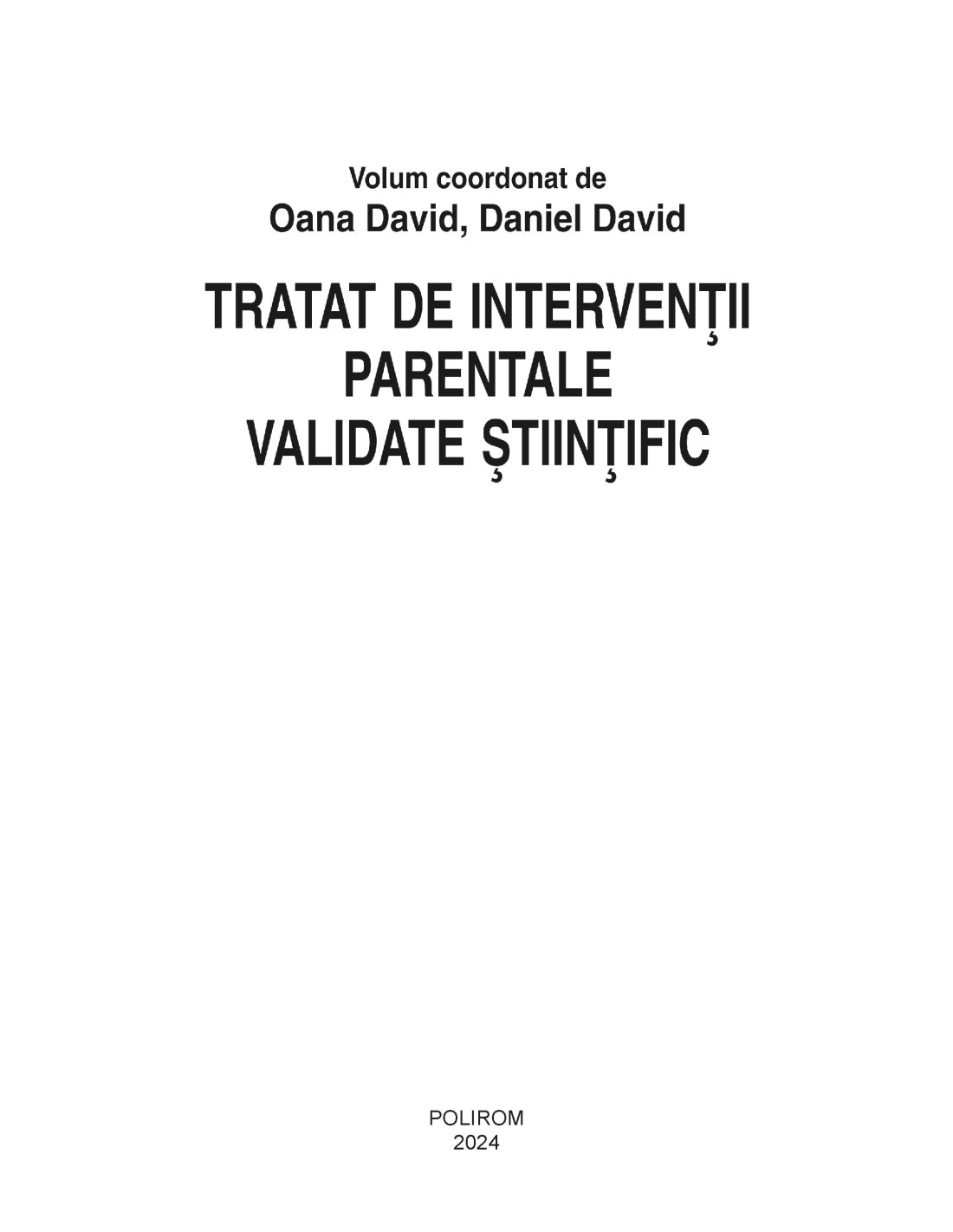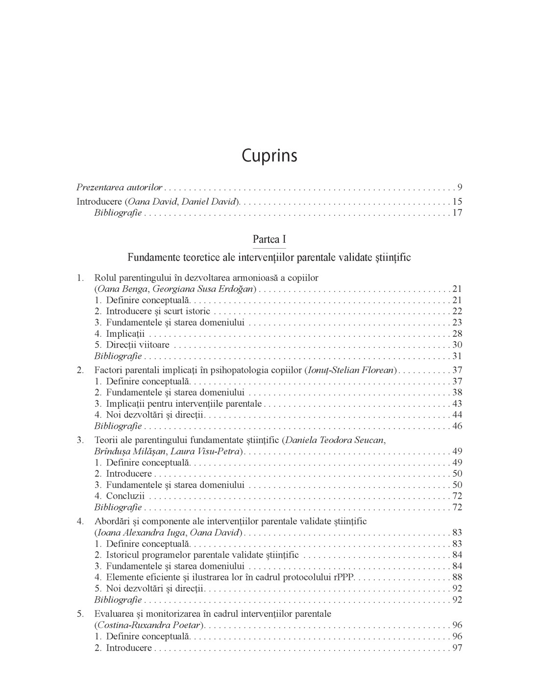 „Cartea de față este primul tratat de intervenții parentale validate științific dedicat sistematizării cunoașterii științifice din acest domeniu de către experți recunoscuți, din cadrul marilor centre universitare din România, cu scopul de a-i ajuta pe specialiștii care doresc să ofere sprijin parental. Volumul își propune astfel să ofere ghidaj și trimiteri către protocoale de intervenție actuale și inovative, care pot să dezvolte eficient abilități parentale relevante pentru sănătatea mintală a copiilor.