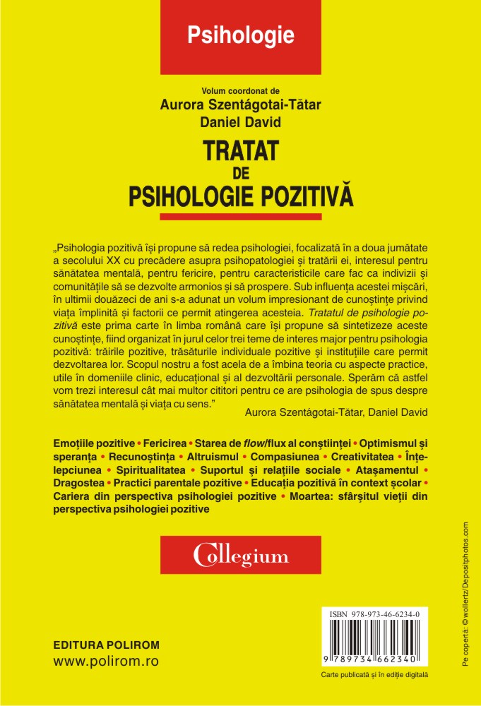 „Psihologia pozitivă îşi propune să redea psihologiei, focalizată în a doua jumătate a secolului XX cu precădere asupra psihopatologiei şi tratării ei, interesul pentru sănătatea mentală, pentru fericire, pentru caracteristicile care fac ca indivizii şi comunităţile să se dezvolte armonios şi să prospere. Sub influenţa acestei mişcări, în ultimii douăzeci de ani s-a adunat un volum impresionant de cunoştinţe privind viaţa împlinită şi factorii ce permit atingerea acesteia. Tratatul de psihologie pozitivă este prima carte în limba română care îşi propune să sintetizeze aceste cunoştinţe, fiind organizat în jurul celor trei teme de interes major pentru psihologia pozitivă: trăirile pozitive, trăsăturile individuale pozitive şi instituţiile care permit dezvoltarea lor. Scopul nostru a fost acela de a îmbina teoria cu aspecte practice, utile în domeniile clinic, educaţional şi al dezvoltării personale. Sperăm că astfel vom trezi interesul cît mai multor cititori pentru ce are psihologia de spus despre sănătatea mentală şi viaţa cu sens.” (Aurora Szentágotai-Tătar, Daniel David)