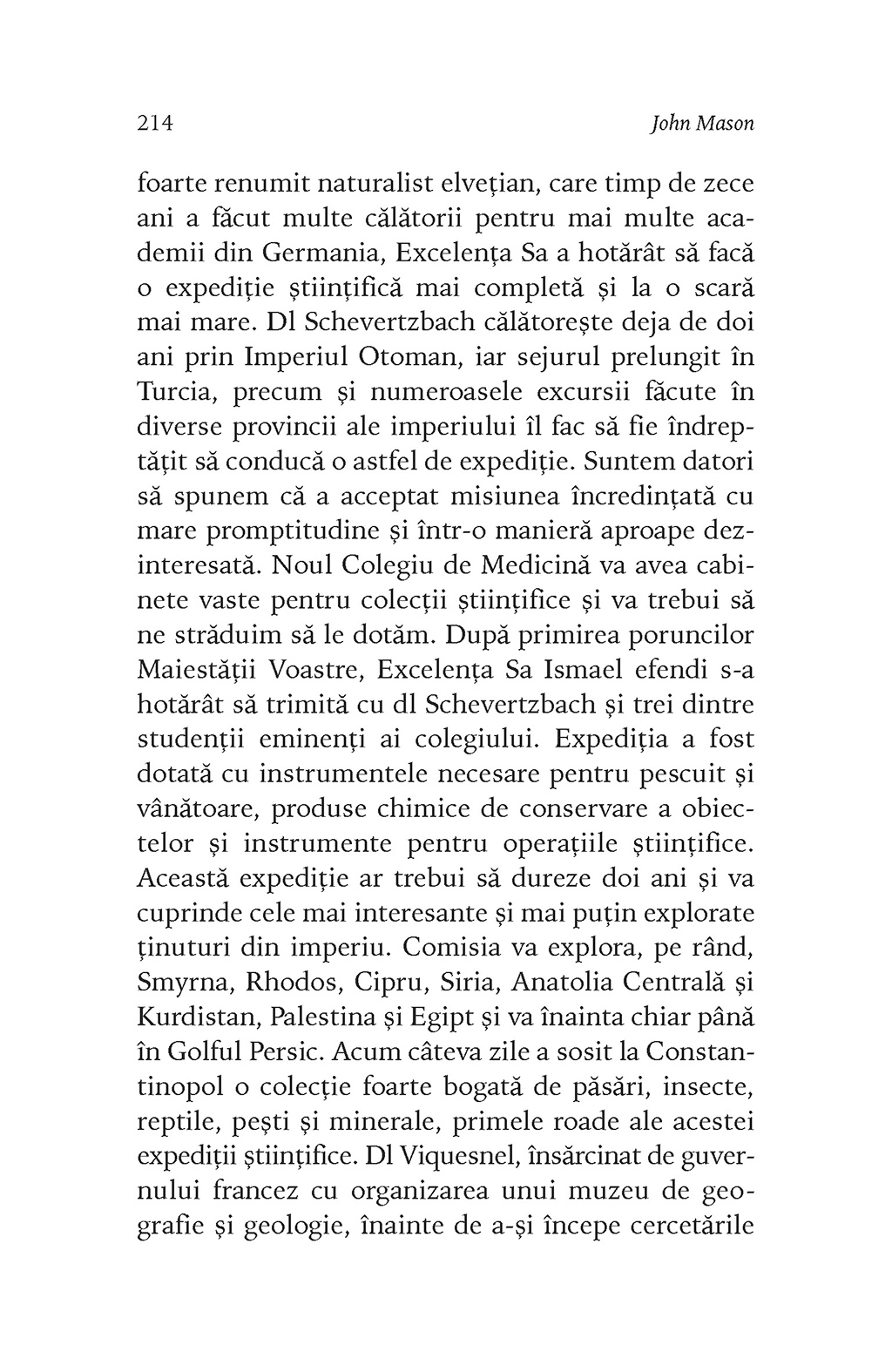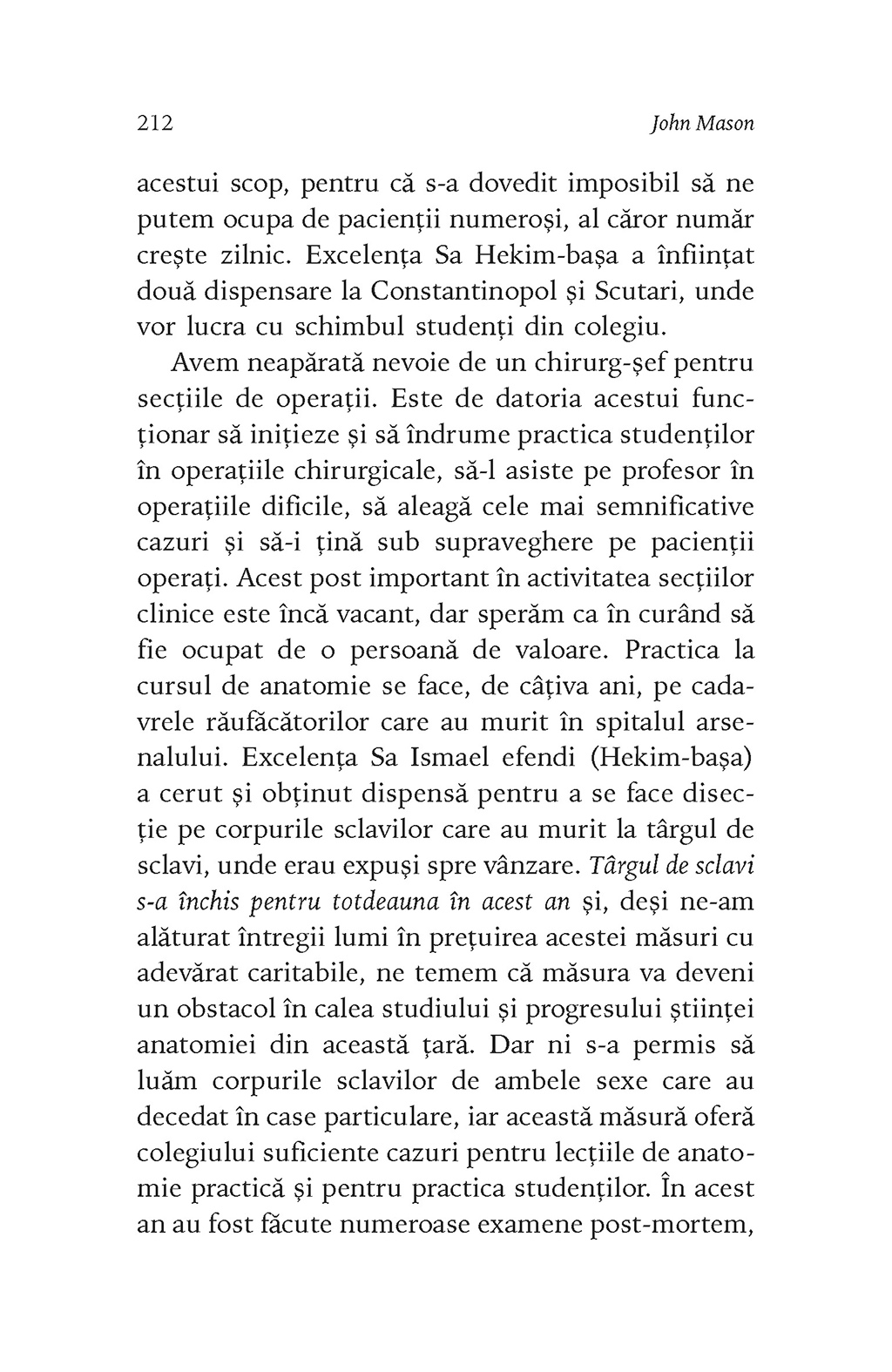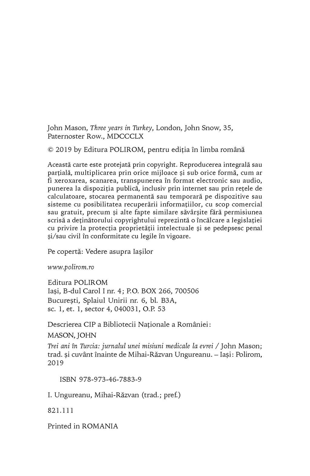 „John Mason ajunge în Moldova, apoi la Constantinopole, în calitate de medic misionar, cu un contract de trei ani – pe care nu îl va putea împlini pînă la capăt. La Iași ajunge la început de mai 1846, după un lung drum pe Mediterana și pe uscat apoi, trecînd prin carantina de la Galați și întîlnindu‑i pentru prima oară pe evreii localnici. Mason detaliază, utilizînd un fel de antropologie religioasă avant la lettre, sărbători și ritualuri observate în casele evreilor, elementele semnificative de calendar religios, portretizînd membrii de frunte ai comunității locale. Același spirit de observație se va manifesta și în capitala Imperiului Otoman, de această dată, însă, curiozitatea sa oprindu‑se asupra învățăturilor islamice și a Coranului. Descrierile privind starea evreilor din Iași, Iașii înșiși – capitală a Moldovei –, modalitățile prin care medicul putea interveni pentru a ușura suferințele trupești, interacțiunea cu localnicii fac lectura interesantă atît pentru istoricul epocii, cît și pentru profan. Rostul aventurii sale în Moldova și în Imperiul Otoman trebuie înțeles ca datorie a civilizației căreia îi aparținea și ca tribut firesc oferit propriei educații.” (Mihai-Răzvan Ungureanu)