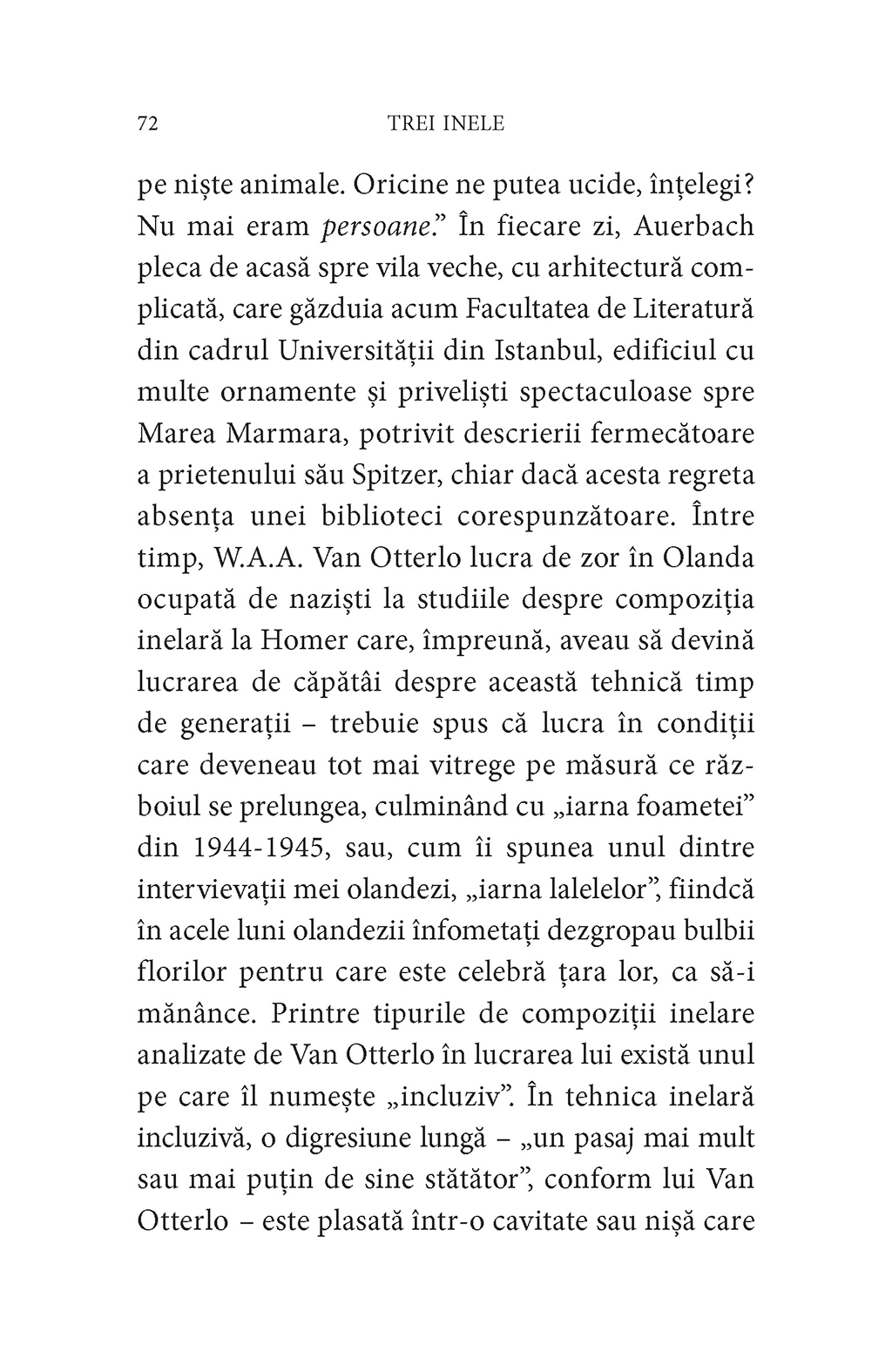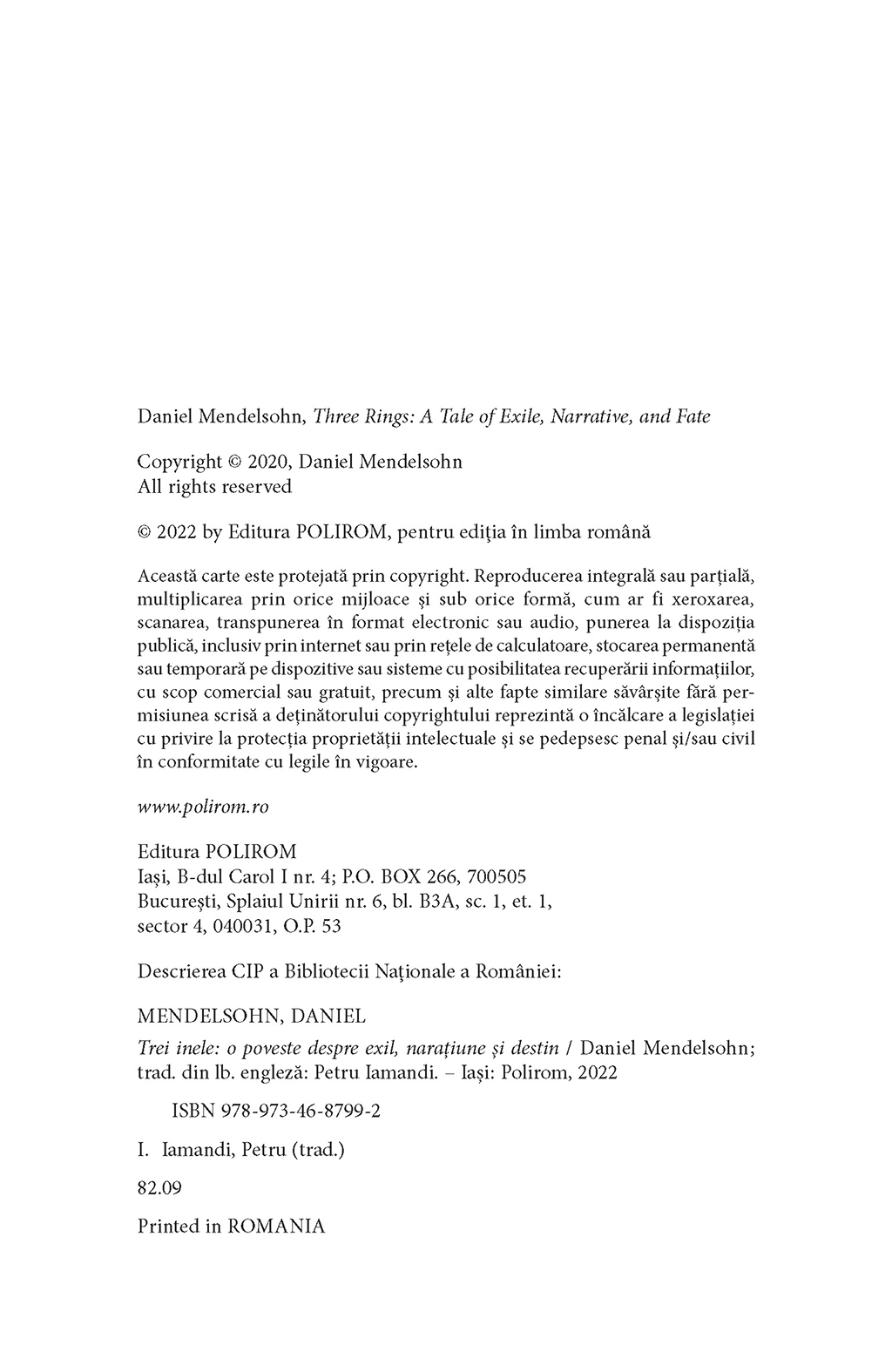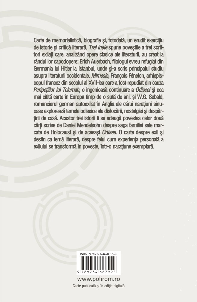 Carte de memorialistică, biografie şi, totodată, un erudit exerciţiu de istorie şi critică literară, Trei inele spune poveştile a trei scriitori exilaţi care, analizând opere clasice ale literaturii, au creat la rândul lor capodopere: Erich Auerbach, filologul evreu refugiat din Germania lui Hitler la Istanbul, unde şi-a scris principalul studiu asupra literaturii occidentale, Mimesis, François Fénelon, arhiepiscopul francez din secolul al XVII-lea care a fost repudiat din cauza Peripeţiilor lui Telemah, o ingenioasă continuare a Odiseei şi cea mai citită carte în Europa timp de o sută de ani, şi W.G. Sebald, romancierul german autoexilat în Anglia ale cărui naraţiuni sinuoase explorează temele odiseice ale dislocării, nostalgiei şi despărţirii de casă. Acestor trei istorii li se adaugă povestea celor două cărţi scrise de Daniel Mendelsohn despre saga familiei sale marcate de Holocaust şi de aceeaşi Odisee. O carte despre exil şi destin ca temă literară, despre felul cum experienţa personală a exilului se transformă în poveste, într-o naraţiune exemplară.