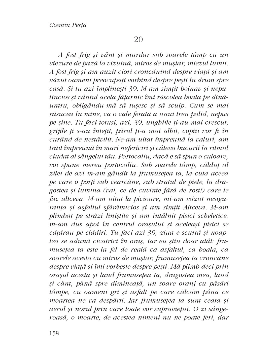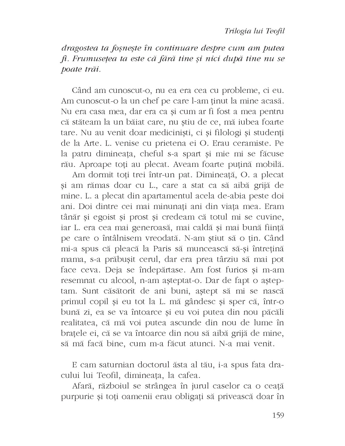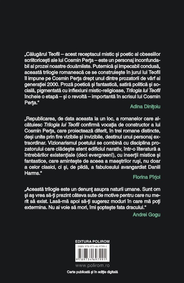 „Republicarea, de data aceasta la un loc, a romanelor care alcătuiesc Trilogia lui Teofil confirmă vocația de constructor a lui Cosmin Perța, care proiectează diferit, în trei romane distincte, deși unite prin fire vizibile și invizibile, destinul unui personaj extraordinar. Vizionarismul poetului se combină cu disciplina prozatorului care clădește atent edificiul narativ, într-o literatură a întrebărilor existențiale (deci evergreen!), cu inserții mistice și fantastice, care amintește de aceea a maeștrilor ruși, nu doar a celor clasici, ci și, de pildă, a fabulosului avangardist Daniil Harms.” (Florina Pîrjol)