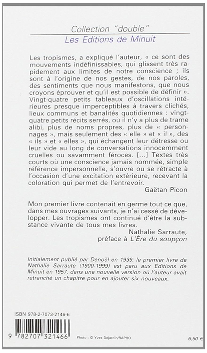 Les tropismes, a expliqué l'auteur, " ce sont des mouvements indéfinissables, qui glissent très rapidement aux limites de notre conscience ; ils sont à l'origine de nos gestes, de nos paroles, des sentiments que nous manifestons, que nous croyons éprouver et qu'il est possible de définir. " Vingt-quatre petits tableaux d'oscillations intérieures presque imperceptibles à travers clichés, lieux communs et banalités quotidiennes : vingt-quatre petits récits serrés, où il n'y a plus de trame alibi, plus de noms propres, plus de " personnages ", mais seulement des " elle " et " il ", des " ils " et " elles ", qui échangent leur détresse ou leur vide au long de conversations innocemment cruelles ou savamment féroces. (...) Textes très courts où une conscience jamais nommée, simple référence impersonnelle, s'ouvre ou se rétracte à l'occasion d'une excitation extérieure, recevant la coloration qui permet de l'entrevoir.
