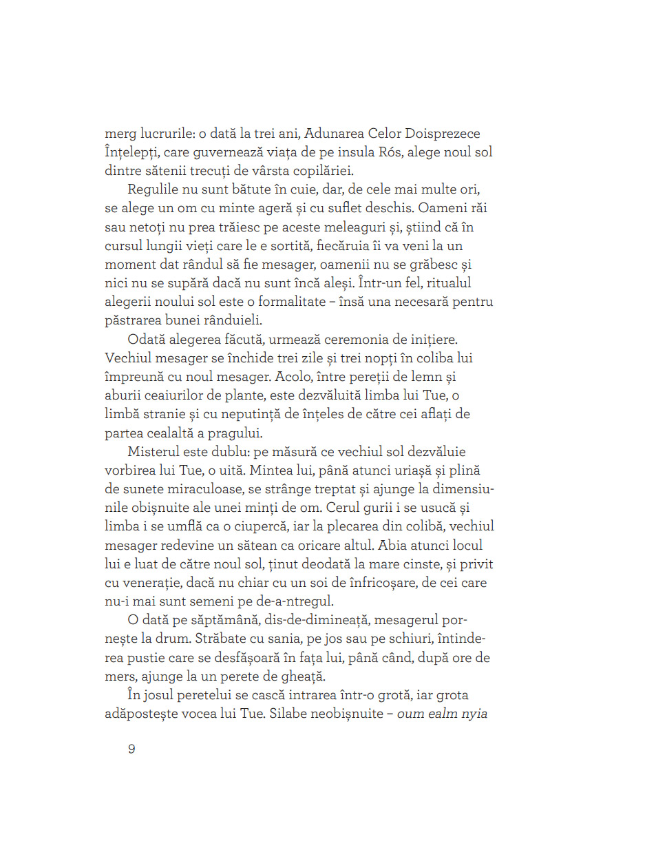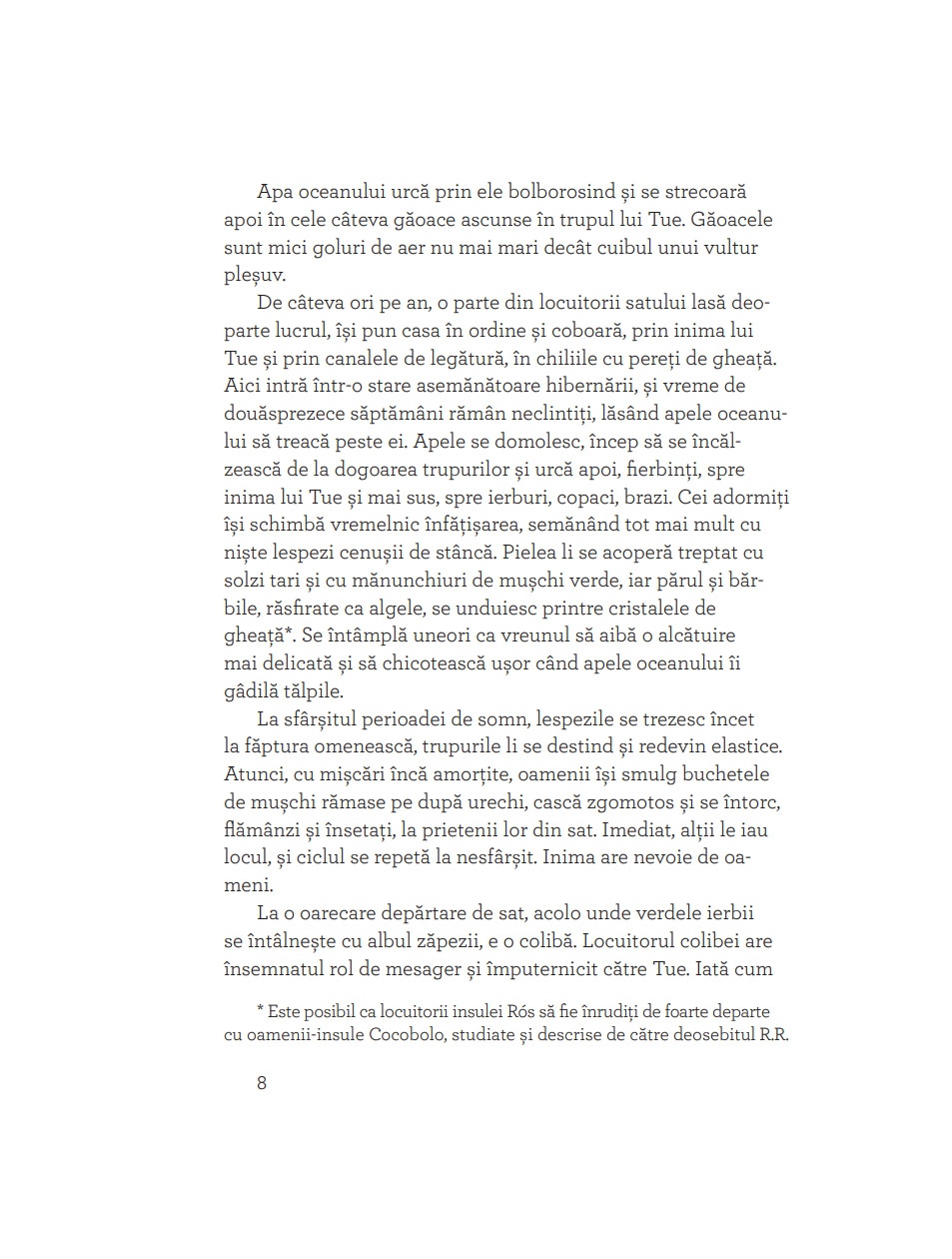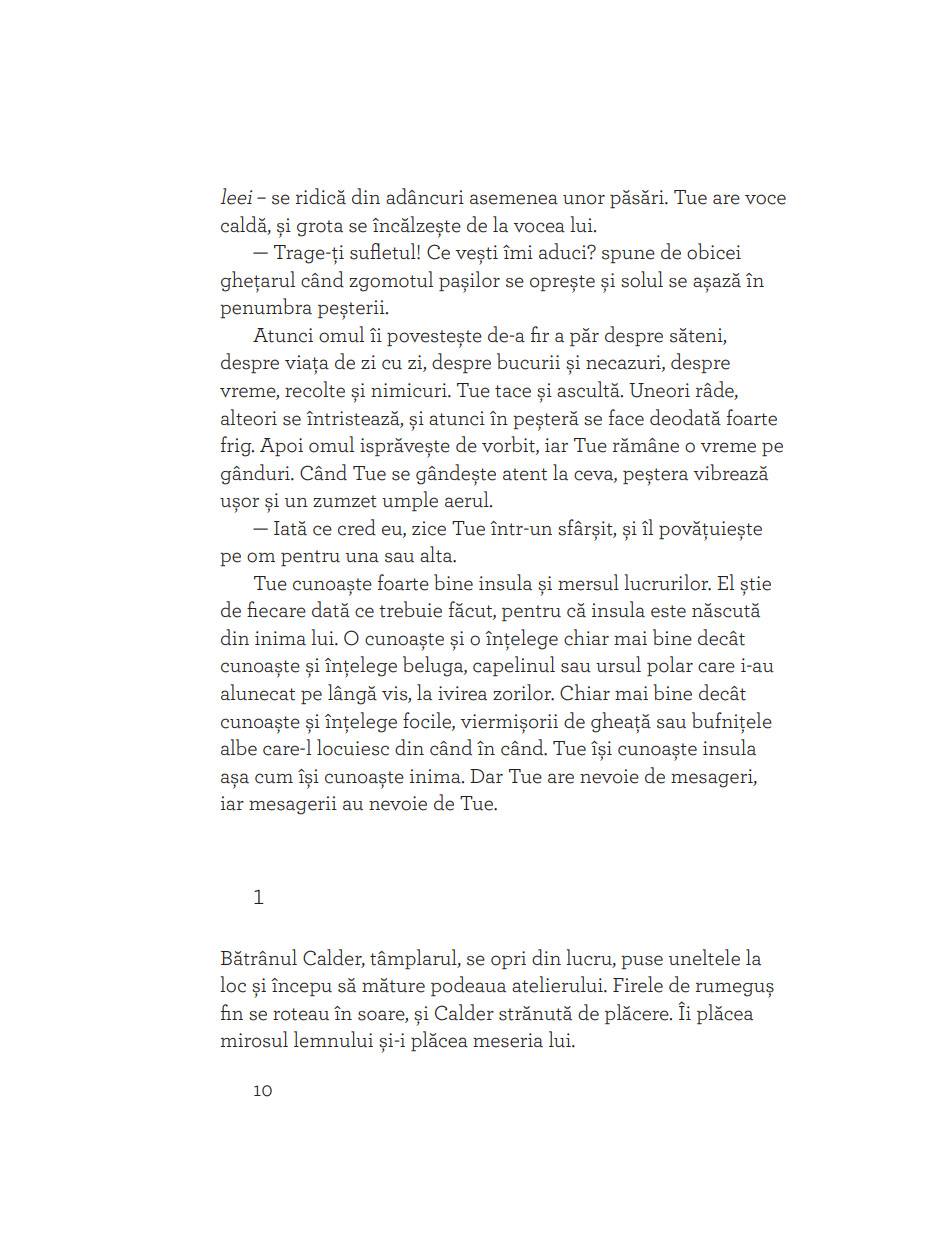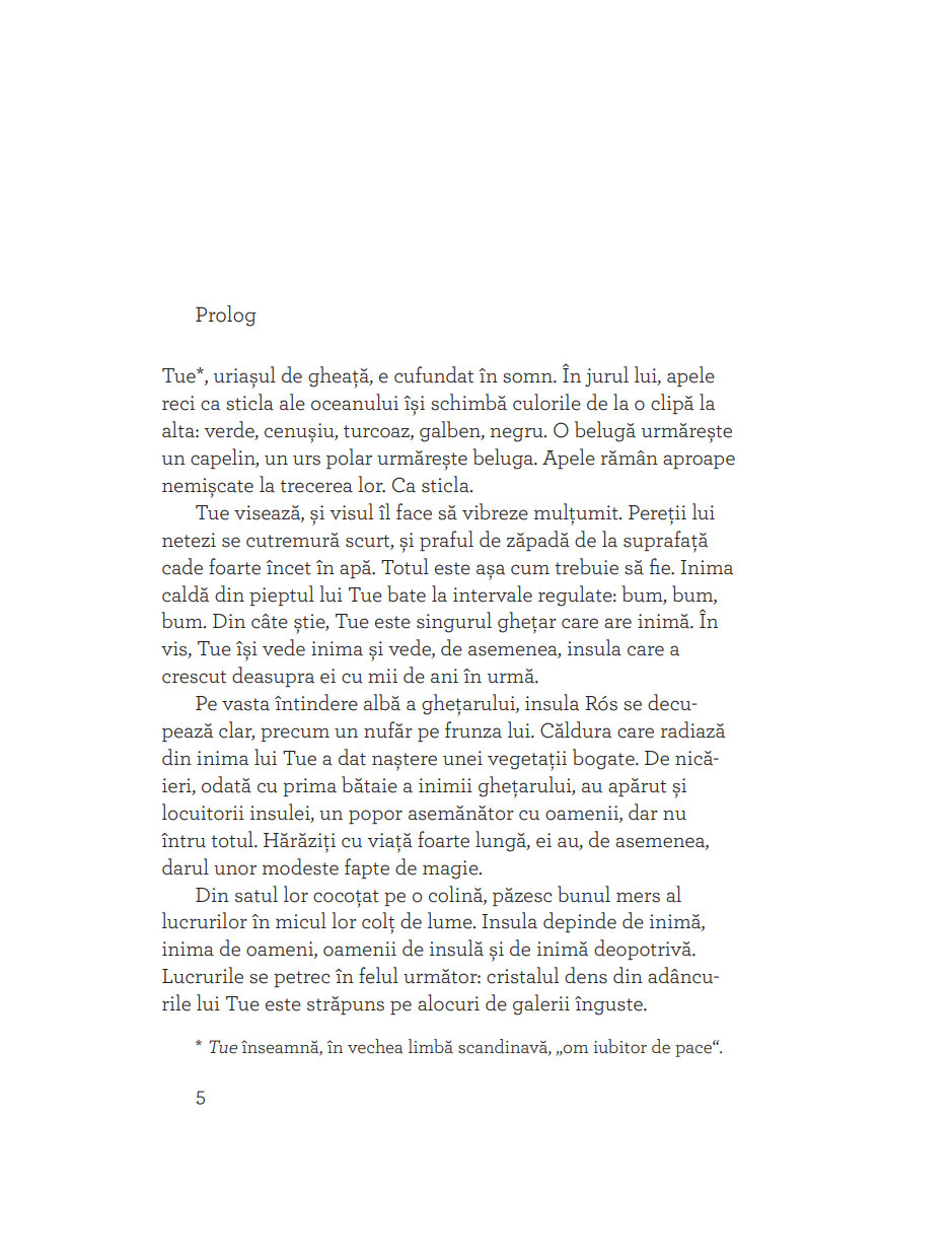 „Dacă aţi citit vreodată basmul despre Inimă-Rece, știţi deja că nu toate inimile sunt la fel. În cartea aceasta veţi da însă peste un gheţar în care bate o inimă caldă și peste un tâmplar în a cărui inimă crește un ghimpe. (Cine n-a avut măcar o dată un ghimpe în inimă? Imposibil! Despre asta e vorba!) Apoi mai e Miranda, care nu îmbătrânește (cum nici noi, cititorii de povești), și un fel de duh rău, Zarar Zimrig, pe care aţi face bine să nu-l întâlniţi niciodată, deși asta e greu de crezut. Așa că e mai bine să fiţi preveniţi: trebuie să-i spuneţi nu. Toţi au loc pe gheţarul Tue, care seamănă bine cu orice tărâm (de basm) locuit. După ce citiţi cartea, vă rog să nu uitaţi două lucruri. Primul: frica îţi trece dacă râzi. Al doilea: când ţi-e foarte dor de un prieten, trebuie să te gândești tare, tare la el și poate o să-ţi bată la ușă.“ — IOANA PÂRVULESCU