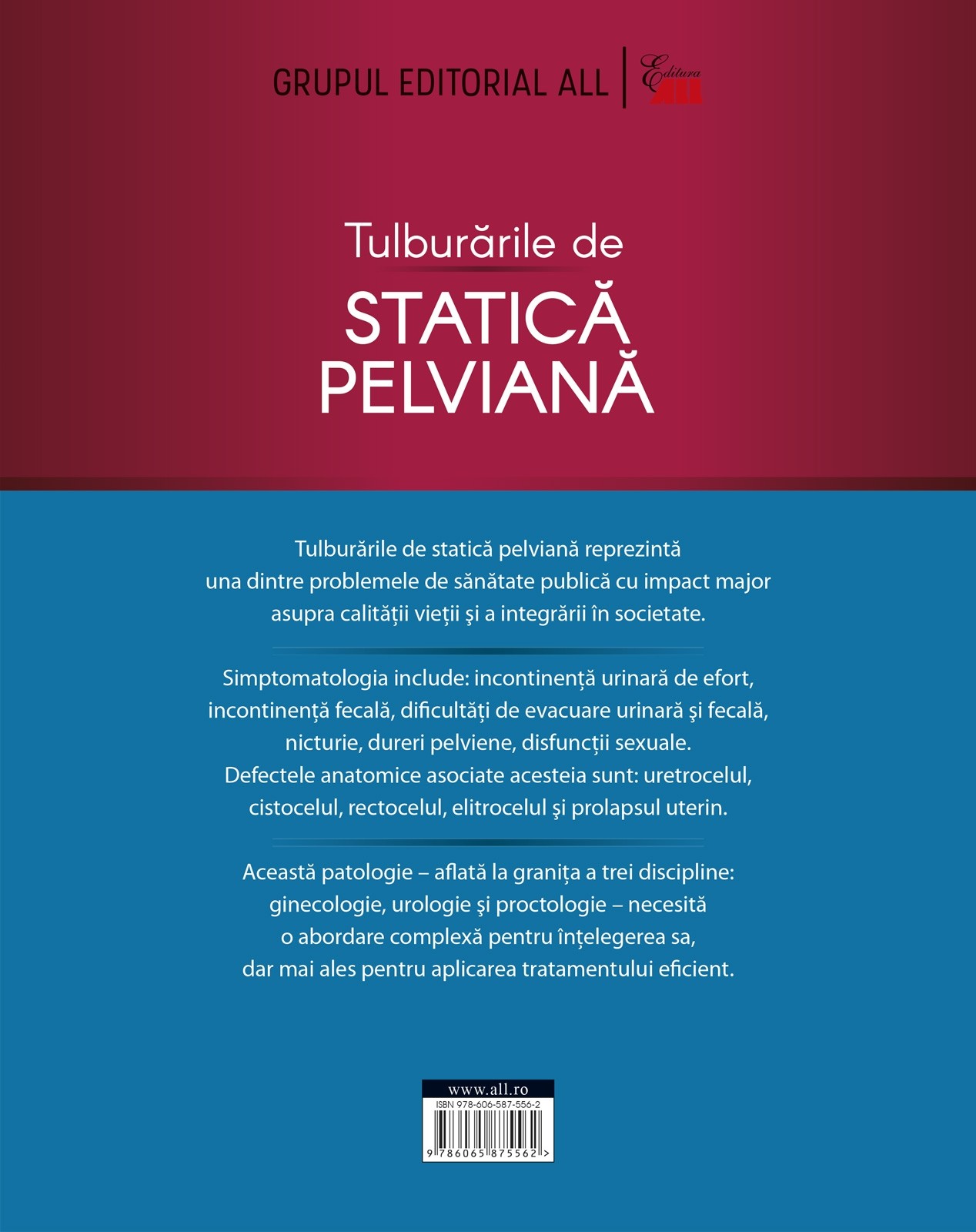 Rezultat in urma eforturilor unui colectiv international de autori, acest volum propune o viziune completa asupra fiziologiei si fiziopatologiei tulburarilor de statica pelviana. De asemenea, descrie tehnicile si mijloacele terapeutice posibile. Scopul este acela de a oferi toate informatiile necesare pentru stabilirea conduitei terapeutice eficiente in fiecare caz. Lucrarea cuprinde si descrierea unei tehnici simplificate de corectie a elitrocelului, unul dintre defectele anatomice asociate simptomatologiei in discutie. Tehnica respectiva reduce riscul accidentelor si incidentelor operatorii, cu rezultate favorabile, iar Dr. Traian Enache, unul dintre autori, detine Brevet de Inventie pentru aceasta.