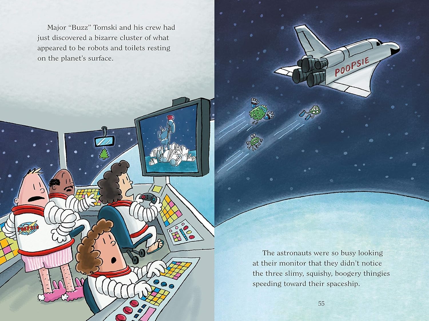 Our heroes defeated the Bionic Booger Boy but they totally forgot about those rascally Robo-Boogers, plus George and Harold's time travelling Purple Potty lands them in a strange, parallel universe. Watch out for the evil twin lookalikes!