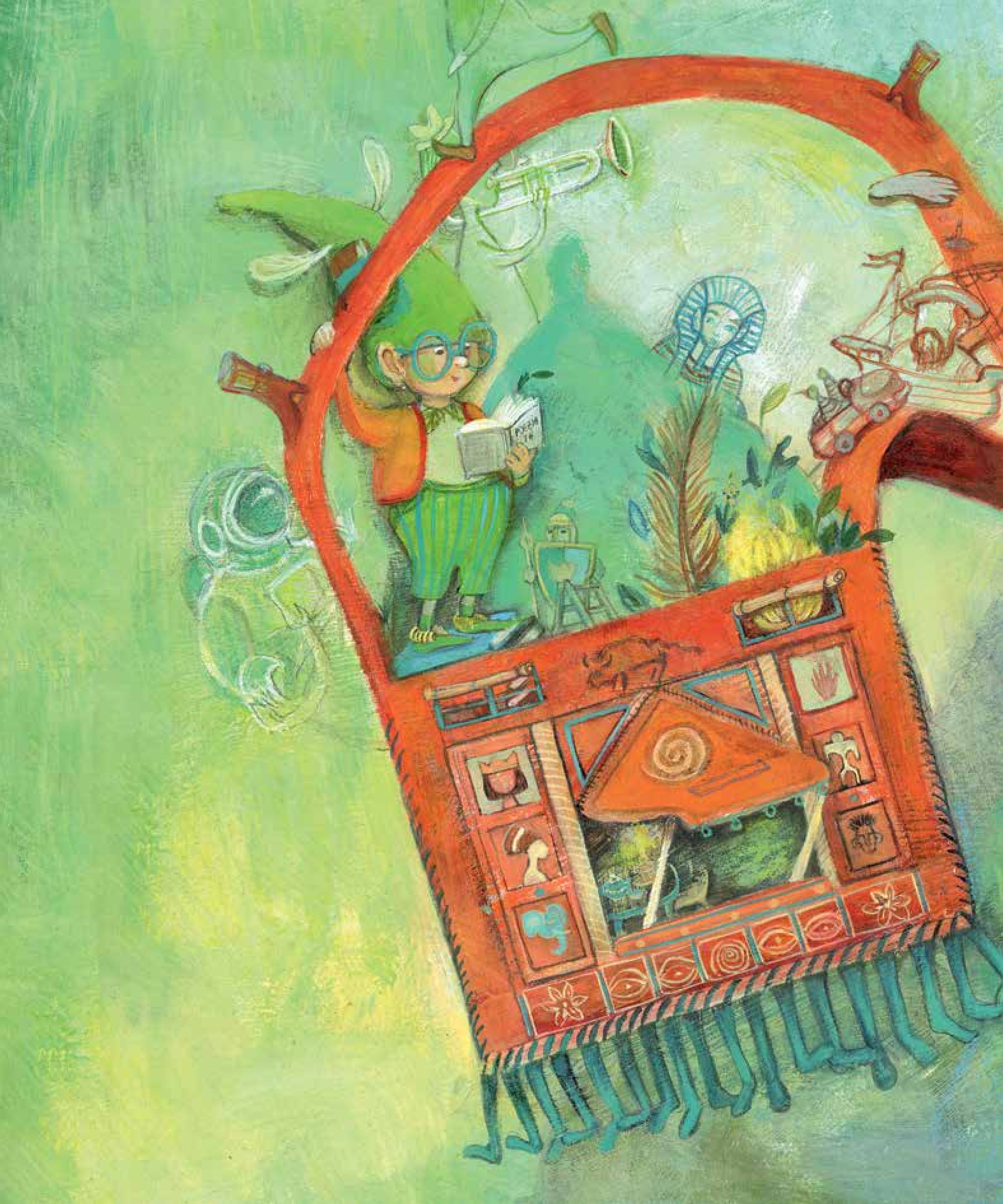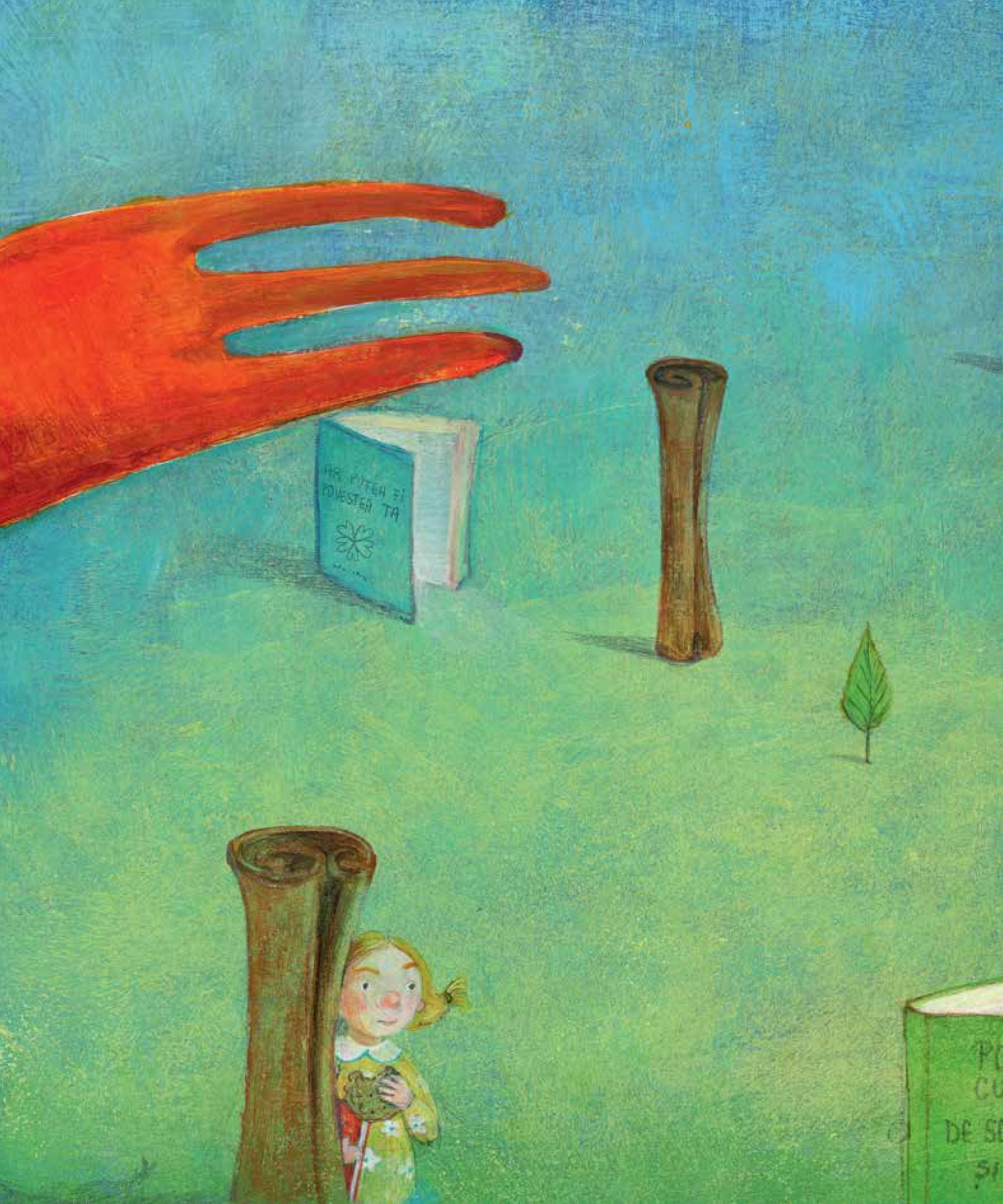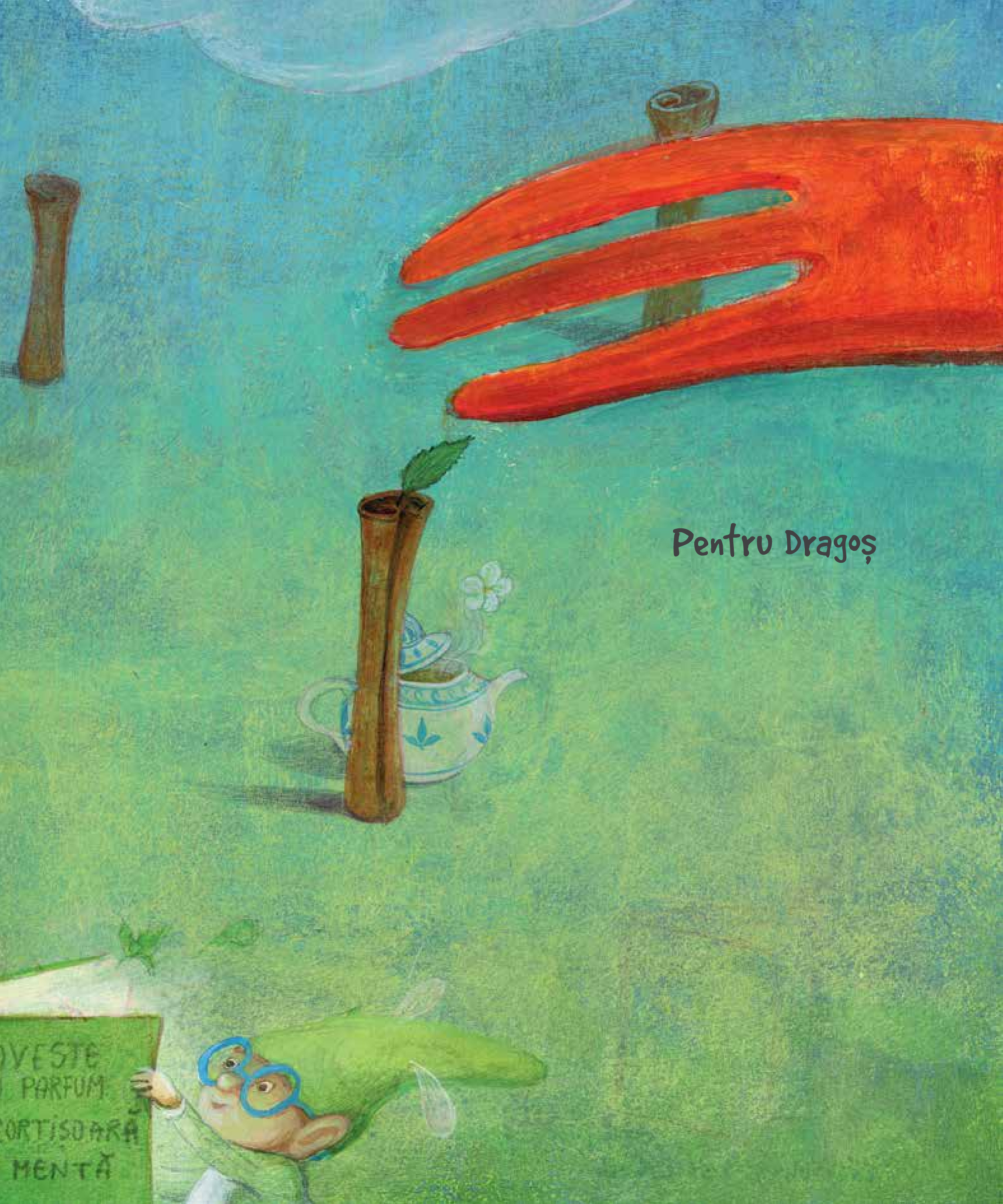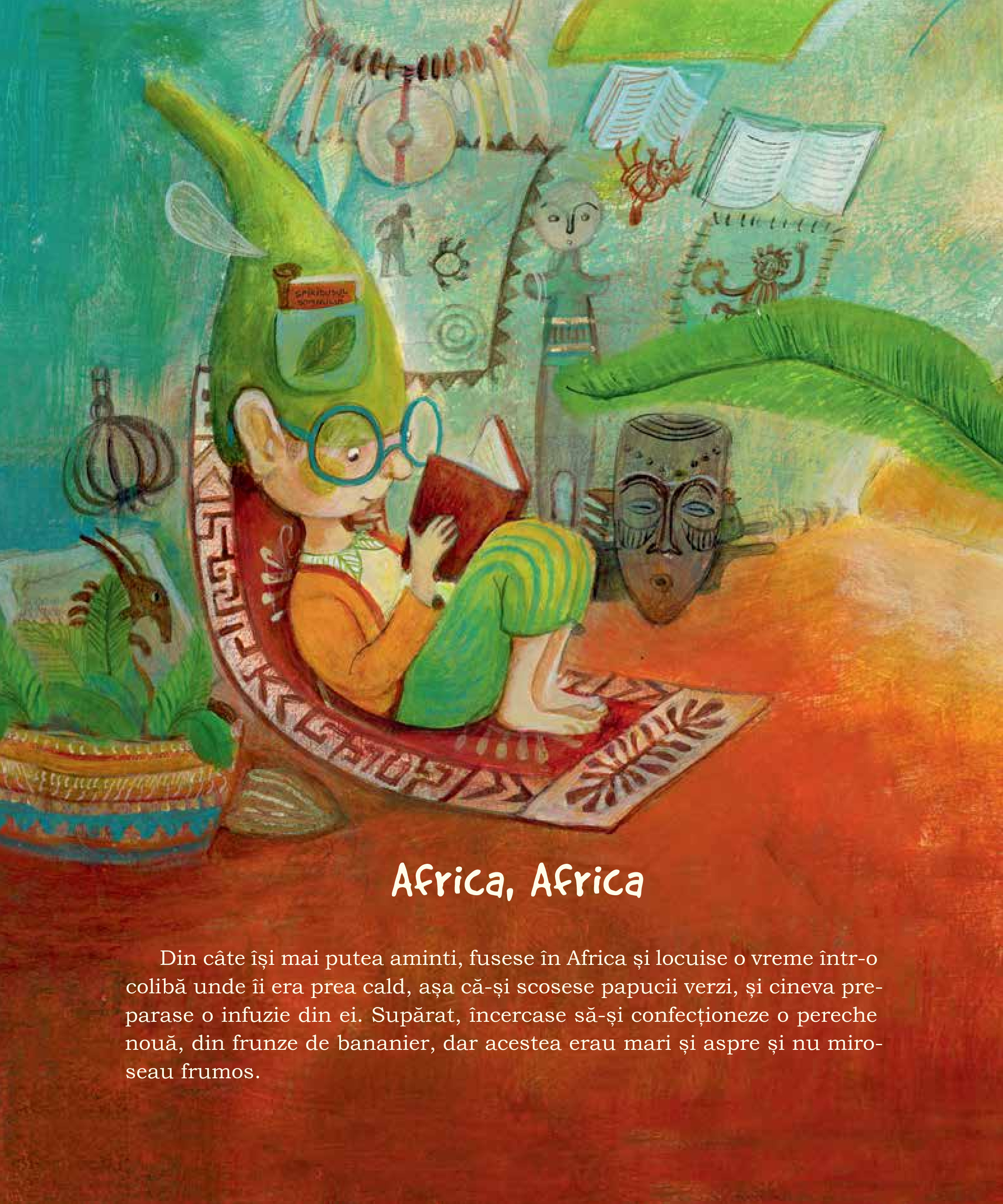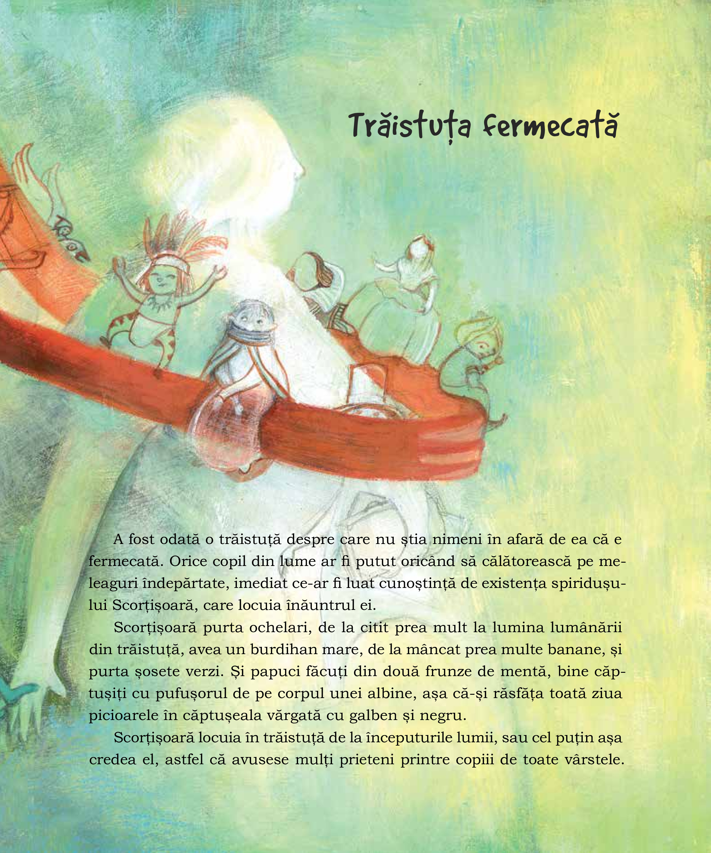 A fost odată ca niciodată un spiriduş într-atât de mic, încât îşi făcuse casă într-o trăistuţă fermecată. Acolo bea ceai parfumat, mânca banane şi, mai presus de toate, citea poveşti la lumina lumânării. Cărţile îi colorau visele, care îl purtau uneori prin lumi fără seamăn; alteori spiriduşul nostru călătorea de-adevăratelea, prin lumea cea mare şi plină de minunăţii: prin Africa arsă de soare, la albul Pol, pe marea înspumată, legănat de o corabie de piraţi, prin ţara pagodelor frumos împodobite…