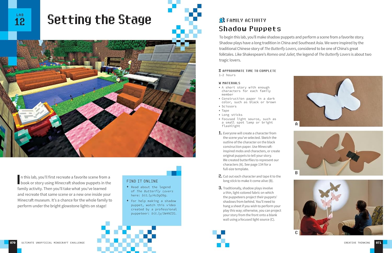 Kids ages 7 to 11 and their families will especially enjoy this fun and unique approach to learning about Minecraft as an educational tool and working on art and craft activities or STEM experiments together.