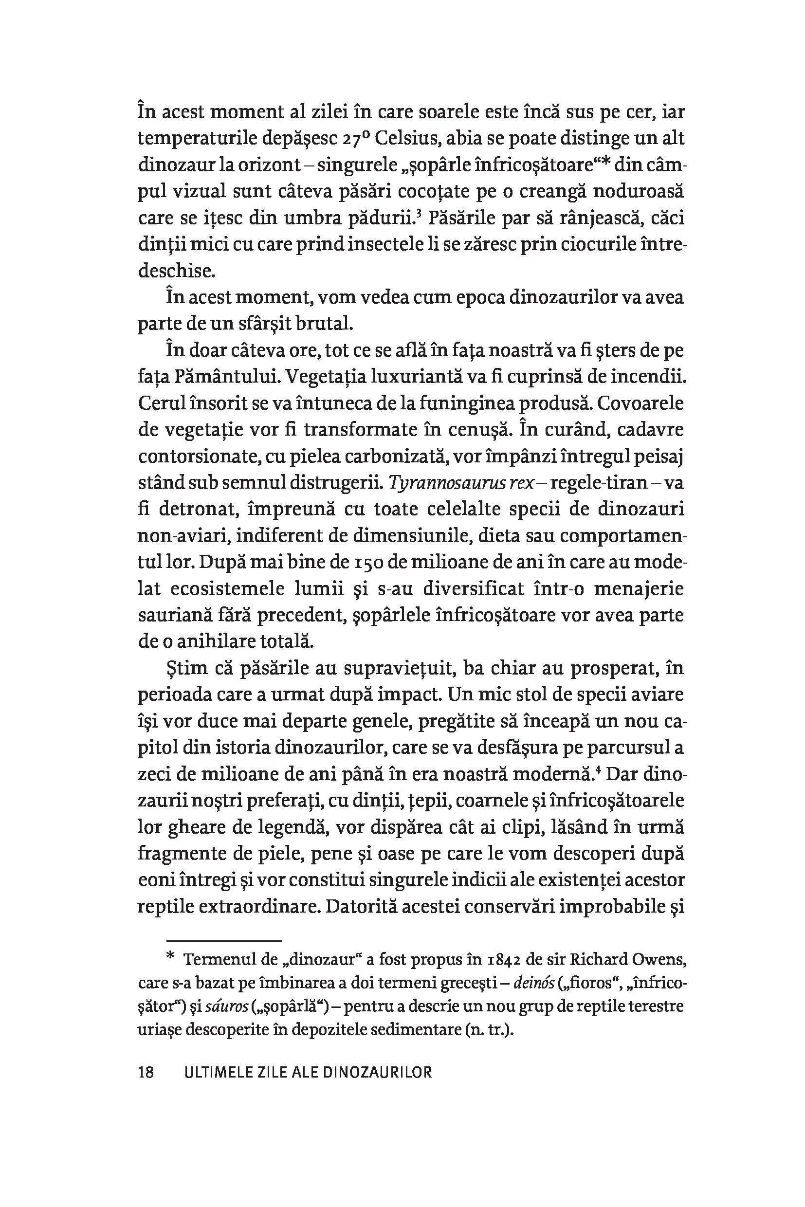 Scrisă într-un stil accesibil și atractiv, Ultimele zile ale dinozaurilor se adresează tuturor celor care vor să afle ce s-a întâmplat în zilele, anii și secolele după ce planeta noastră a fost lovită de un asteroid nimicitor. Este o poveste relatată din perspectiva victimelor și a supraviețuitorilor unuia dintre cele mai mari cataclisme din istoria Pământului.