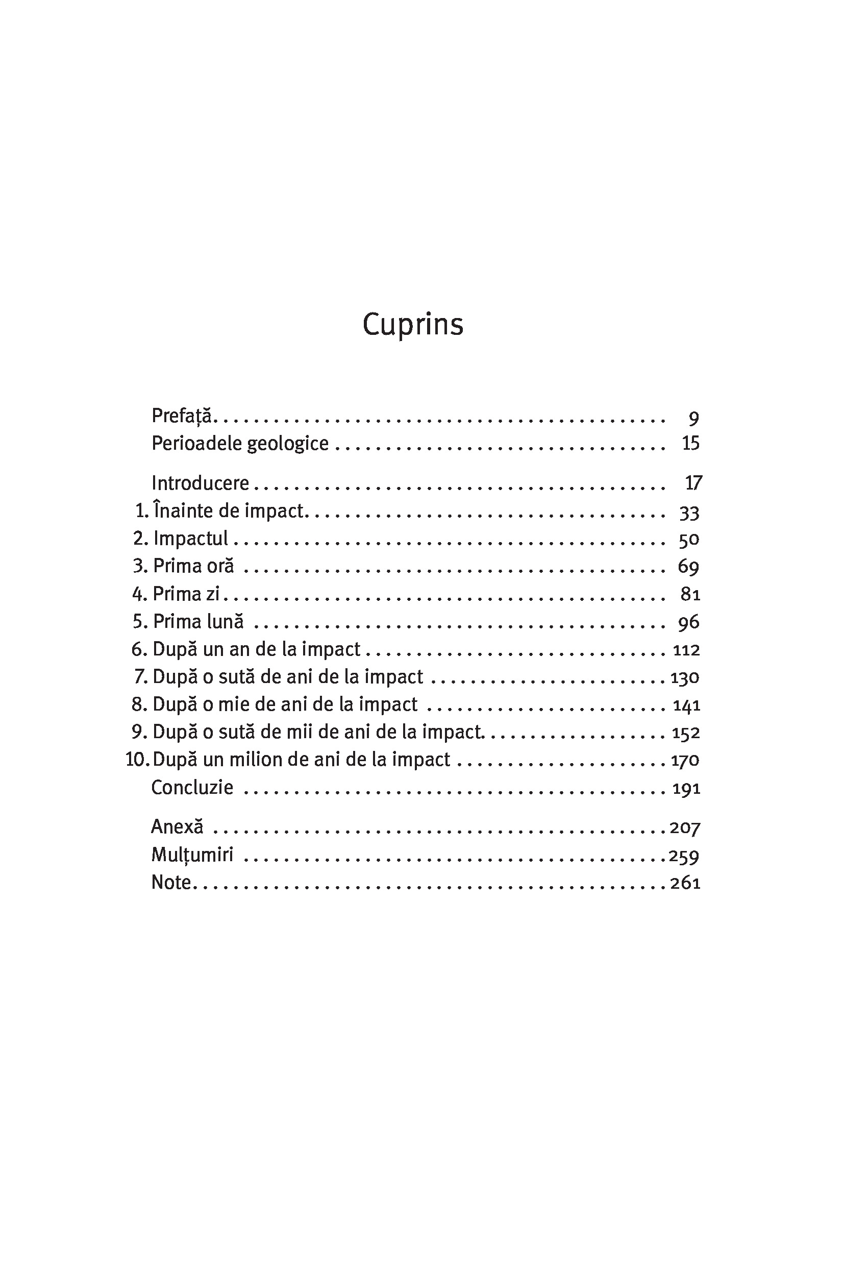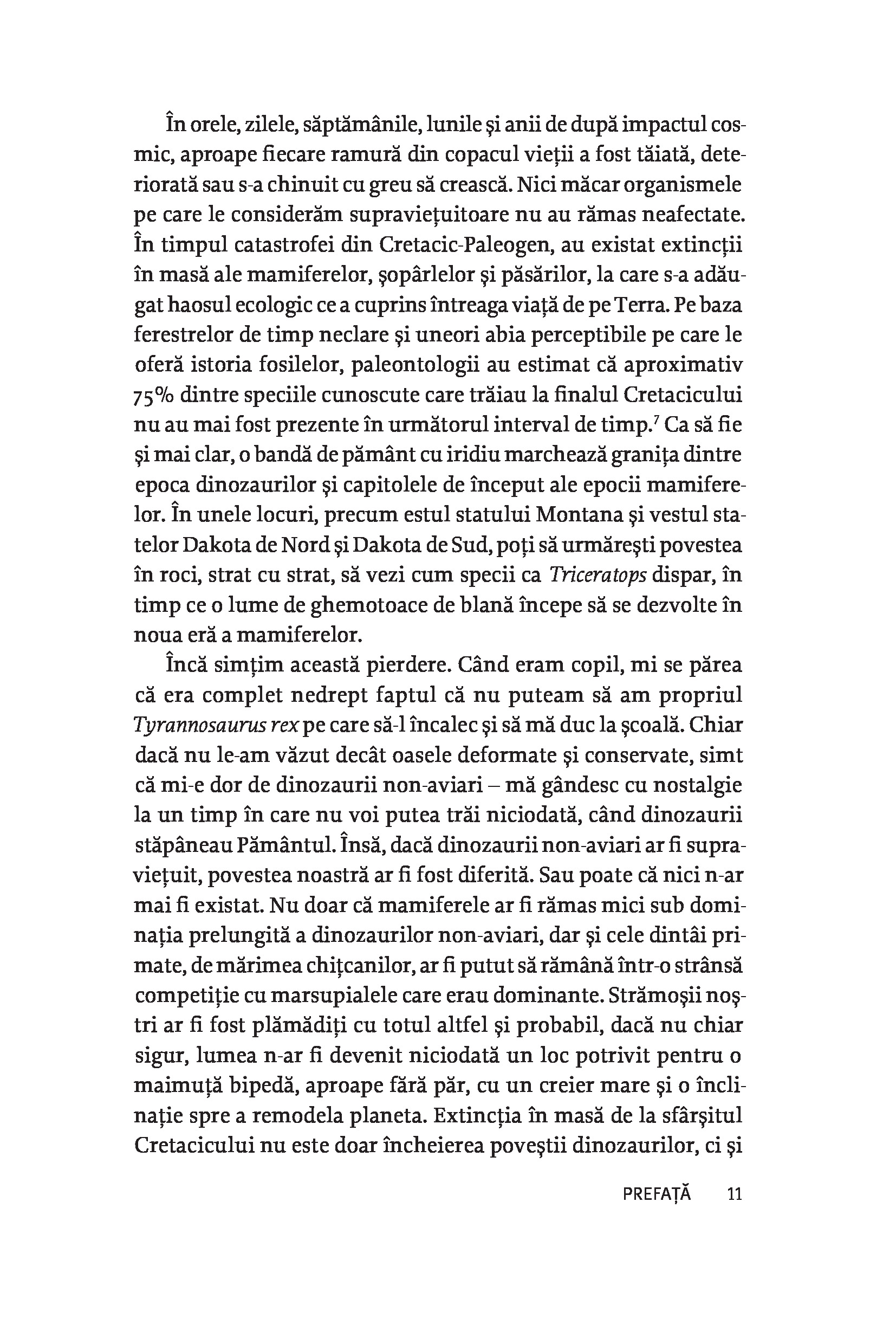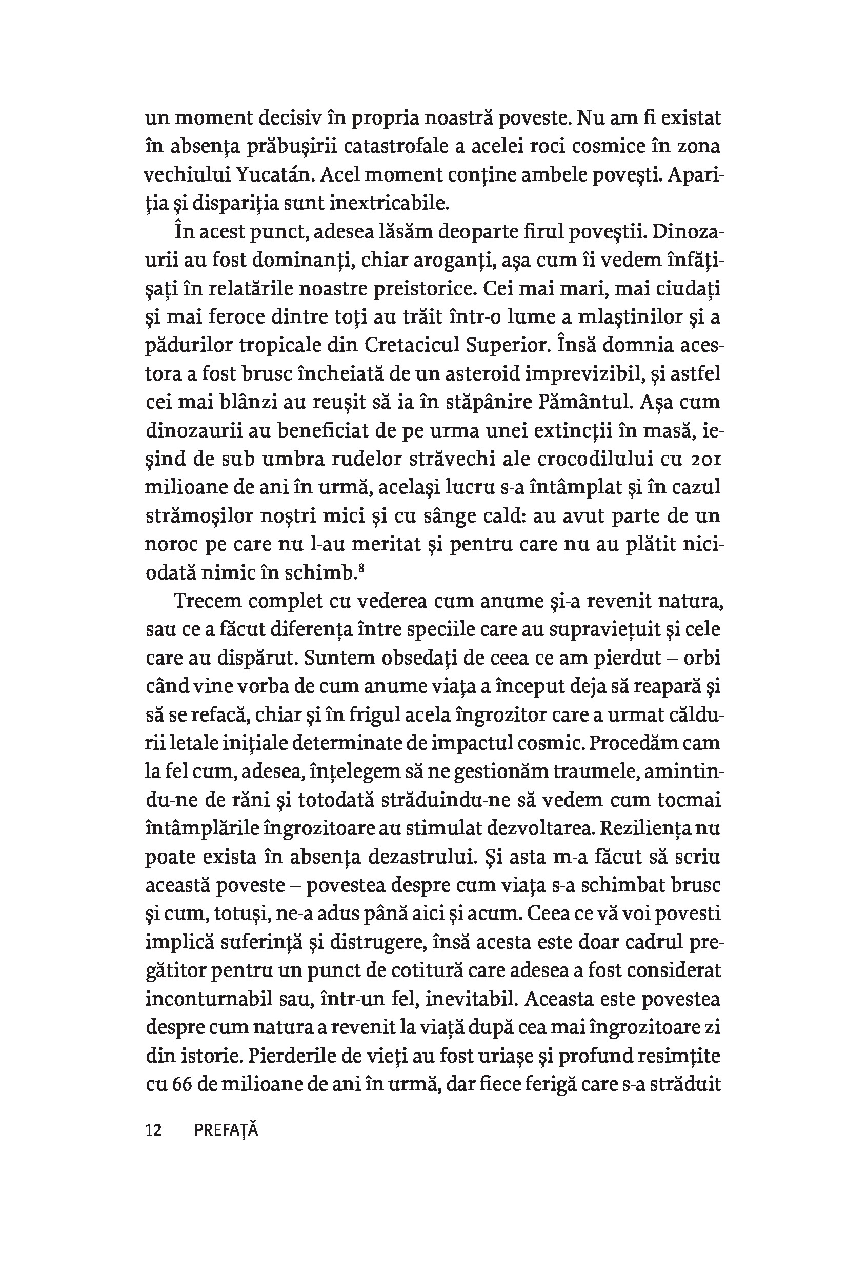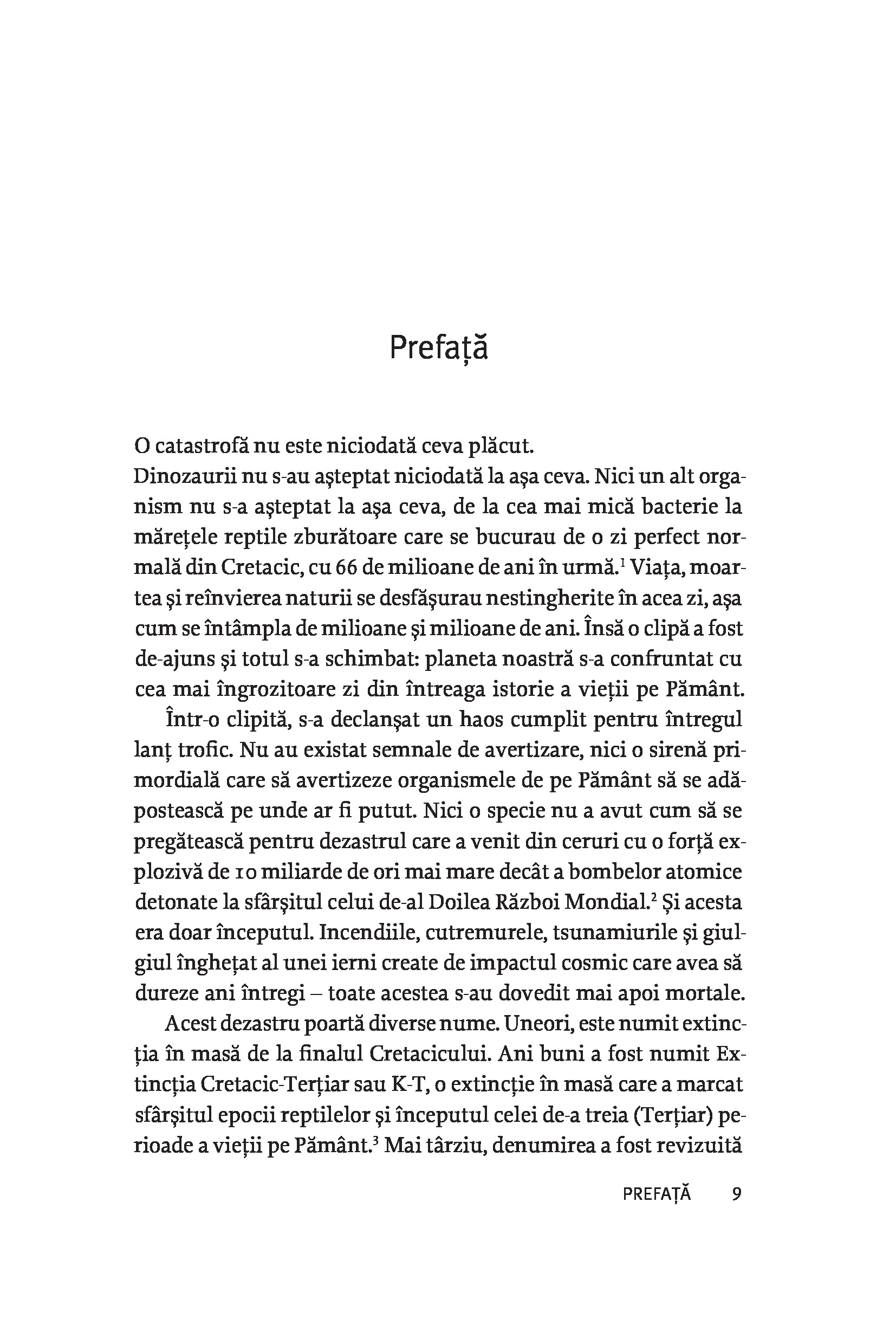 Imaginează-ți că te afli în Cretacic. Este o zi ca oricare alta, o după-amiază însorită în urmă cu 66 de milioane de ani. În doar câteva ore, tot ce vezi cu ochii va fi șters de pe fața Pământului. Vegetația luxuriantă va fi cuprinsă de incendii. Cerul se va întuneca. Înfricoșătorul tiranozaur aflat la vânătoare va fi carbonizat într-o clipă; dominația marilor reptile va lua sfârșit. Însă această catastrofă va fi marea șansă a micilor mamifere ascunse sub pământ: strămoșii omului, specia care domină planeta azi.