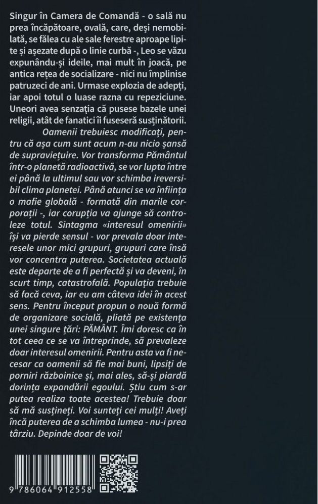 Singur în Camera de Comandă - o sală nu prea încăpătoare, ovală, care, deși nemobilată, se fălea cu ale sale ferestre aproape lipite și așezate după o linie curbă -, Leo se văzu expunându-și ideile, mai mult în joacă, pe antica rețea de socializare - nici nu împlinise patruzeci de ani. Urmase explozia de adepți, iar apoi totul o luase razna cu repeziciune. Uneori avea senzația că pusese bazele unei religii, atât de fanatici îi fuseseră susținătorii.