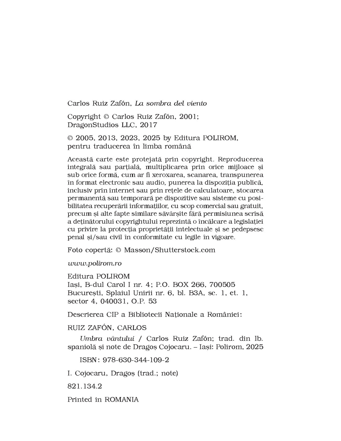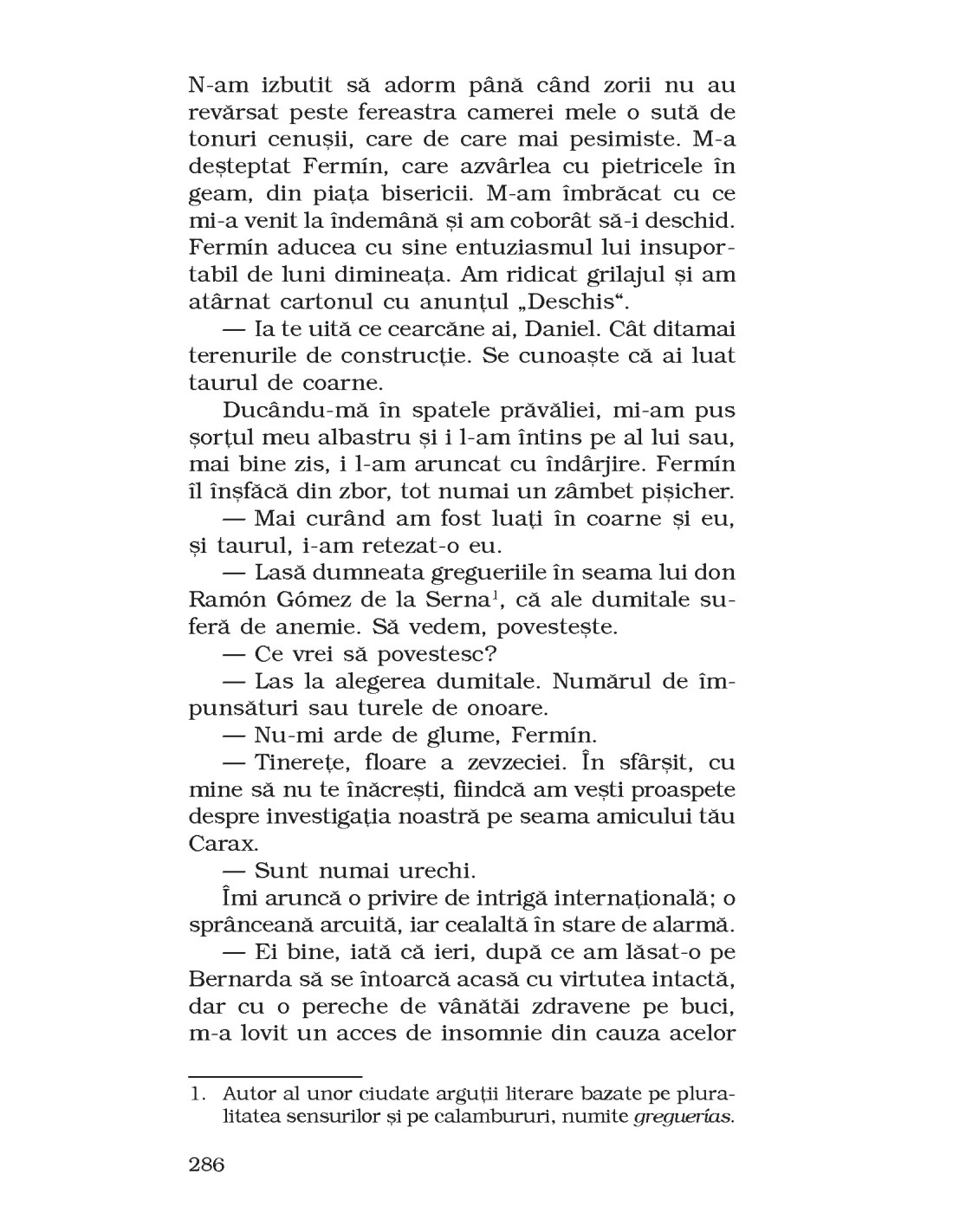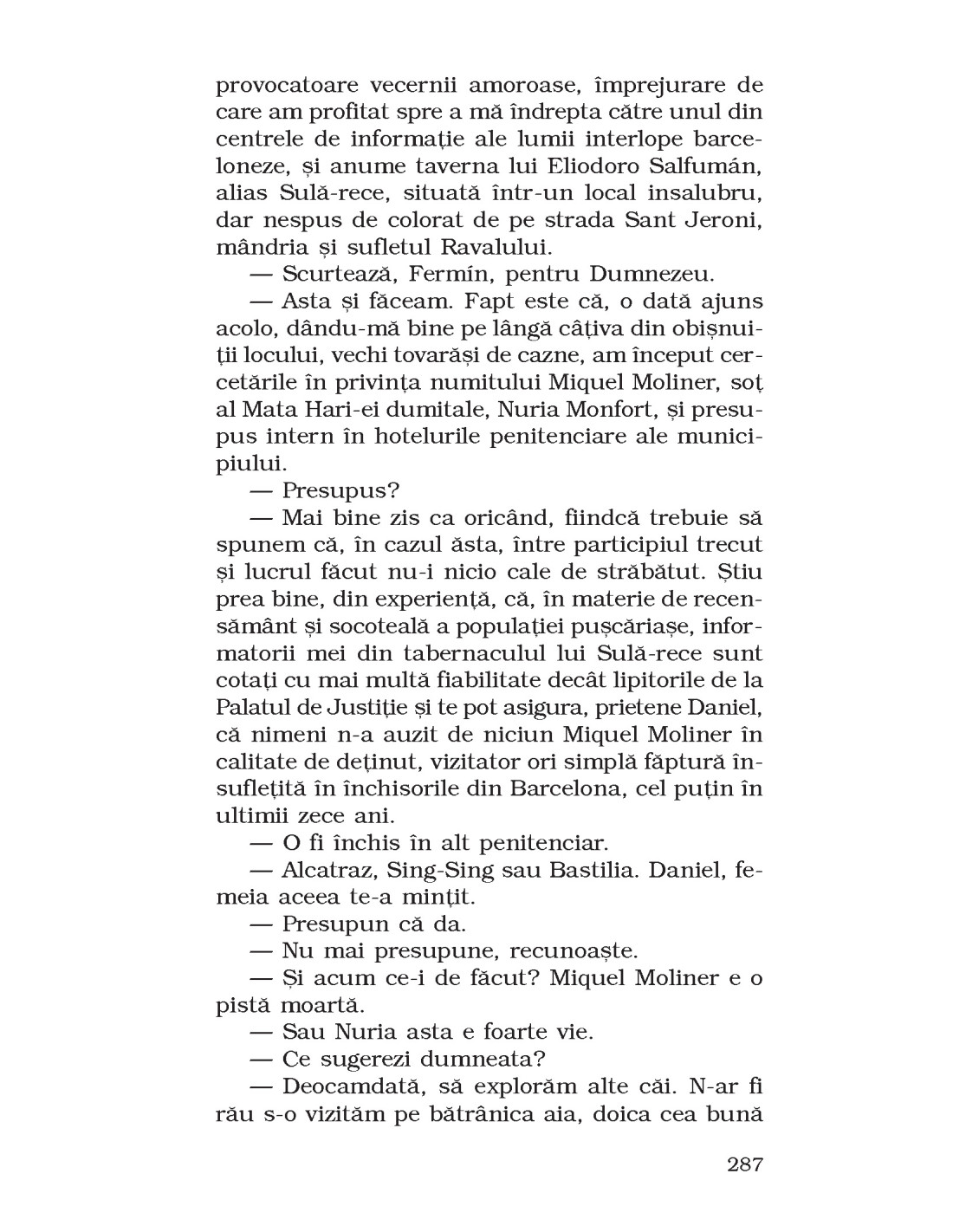 În anii următori, Daniel se pomeneşte implicat într-o serie de intrigi şi crime, trecând prin numeroase primejdii pentru a salva cartea de anumite persoane. În acelaşi timp, cercetează amănunţit biografia autorului, cel puţin la fel de enigmatică şi de stranie ca romanele sale.