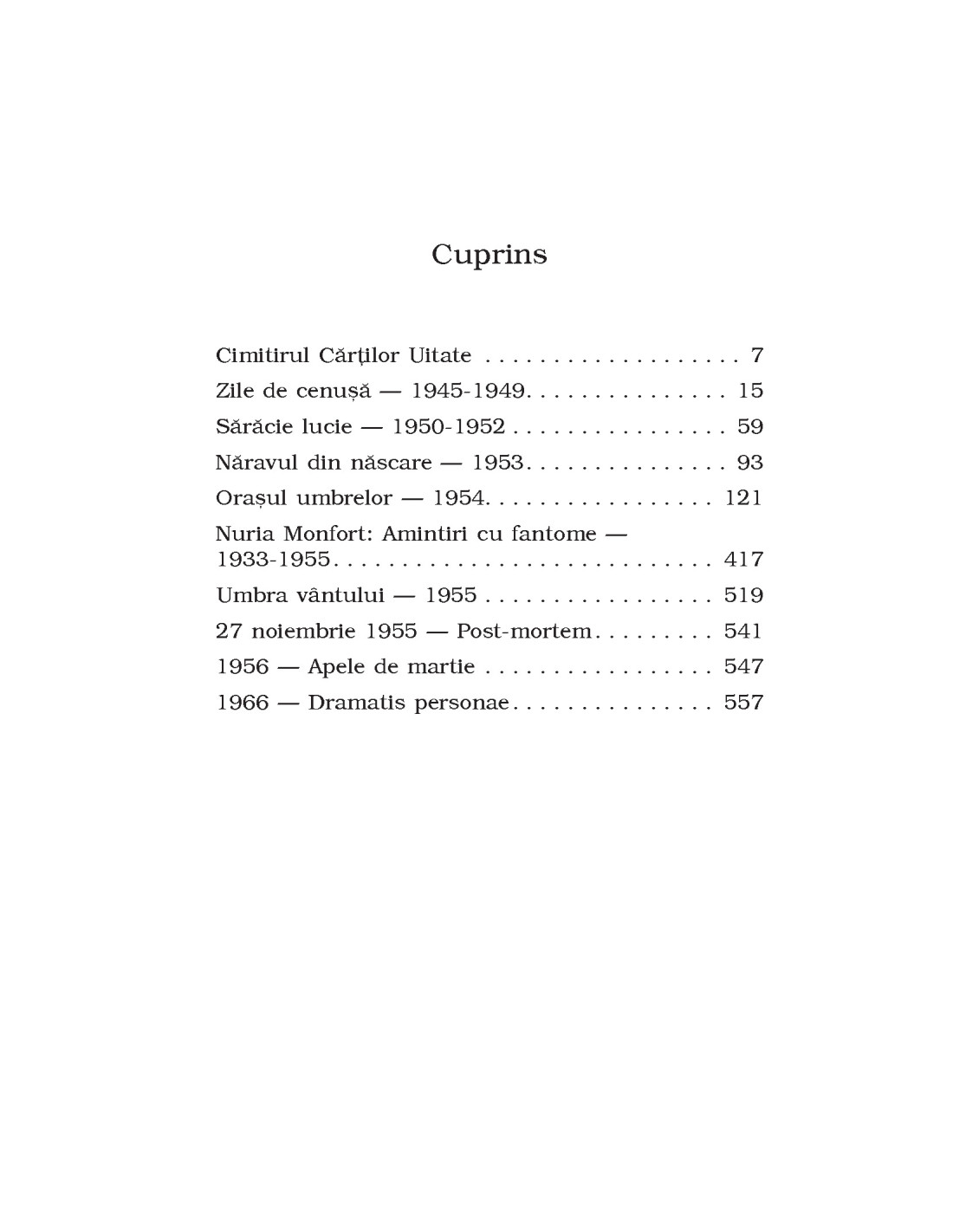 Barcelona anului 1945. Într-o dimineaţă ceţoasă, domnul Sempere, proprietarul unui anticariat din inima oraşului vechi, îşi duce fiul, Daniel, la Cimitirul Cărţilor Uitate, o clădire impunătoare, veche şi sumbră, plină de volume ale unor autori necunoscuţi sau uitaţi, cărţi aduse de oameni care au vrut să le salveze de la părăsire, indiferenţă sau de la dispariţie.
