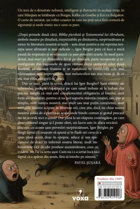 Dar până la un răspuns convingător, pe care doar cititorul singur și-l poate oferi, un lucru este în afara oricărei discuții: cu aceste șase povestiri surprinzătoare, Igor Bergler, pe lângă faptul că reușește să spună și în flash -uri ceea ce a spus până acum doar în epopee, aduce și noi specimene de draci în infernul nostru literar, mult îmbunătățite față de alte produse asemănătoare, ceea ce, evident, nu i se va ierta ușor.