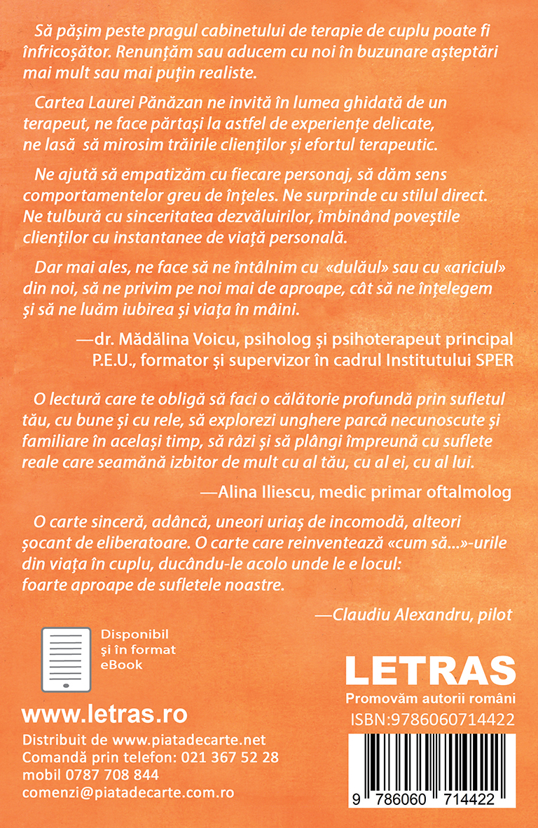Să pășim peste pragul cabinetului de terapie de cuplu poate fi înfricoșător. Renunțăm sau aducem cu noi în buzunare așteptări mai mult sau mai puțin realiste. Cartea Laurei Pănăzan ne invită în lumea ghidată de un terapeut, ne face părtași la astfel de experiențe delicate, ne lasă să mirosim trăirile clienților și efortul terapeutic. Ne ajută să empatizăm cu fiecare personaj, să dăm sens comportamentelor greu de înțeles. Ne surprinde cu stilul direct. Ne tulbură cu sinceritatea dezvăluirilor, îmbinând poveștile clienților cu instantanee de viață personală. Dar mai ales, ne face să ne întâlnim cu «dulăul» sau cu «ariciul» din noi, să ne privim pe noi mai de aproape, cât să ne înțelegem și să ne luăm iubirea și viața în mâini.