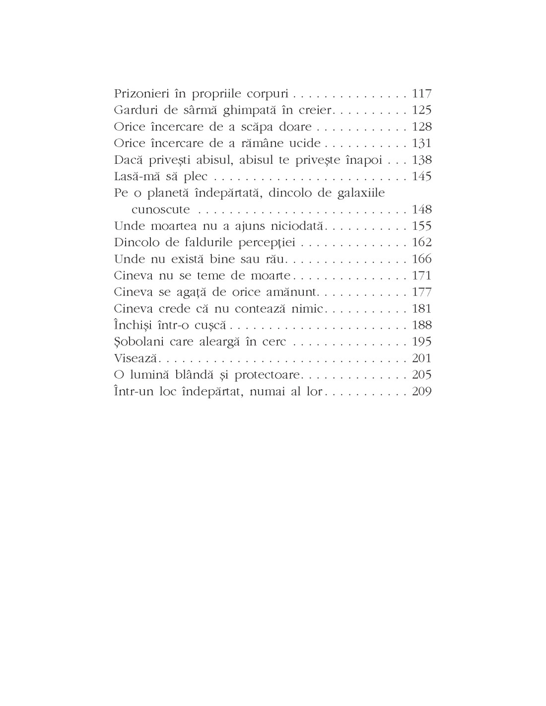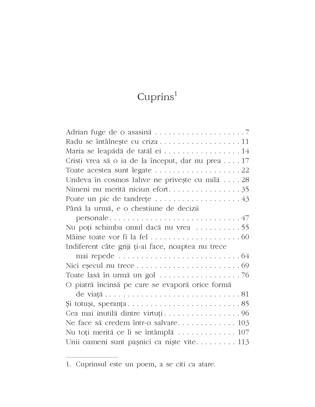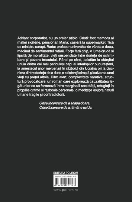 Adrian: corporatist, cu un creier atipic. Cristi: fost membru al mafiei siciliene, pensionar. Maria: casieră la supermarket, fiică de ministru corupt. Radu: profesor universitar de vârsta a doua, măcinat de sentimentul ratării. Forțe fără chip, o lume crudă și lipsită de moralitate, vieți suspendate între dorința de schimbare și povara trecutului. Rând pe rând, asistăm la sfârșitul unuia dintre cei mai periculoși capi ai interlopilor bucureșteni, la amestecul unor mercenari în războiul din Ucraina ori la ciocnirea dintre dorința de a duce o existență simplă și salvarea unei vieți cu prețul alteia. Ritm alert, complexitate narativă, structură provocatoare, un roman care explorează cauzalitatea legăturilor ce se formează între marginalii societății, refugiați în propriile drame și războaie personale, o meditație asupra naturii umane fragile și contradictorii.