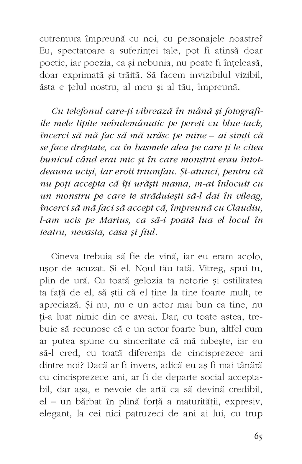„un nor în formă de cămilă rescrie tragedia din Hamlet, recompunînd istoria tulburată a unei familii pentru care teatrul este singurul acasă. O tensionată înfruntare a orgoliilor, singurătăților și obsesiilor, în care fiecare dintre protagoniști încearcă să afle cine este cu adevărat, dincolo de iluziile care se creează în ambianța scenei. Relatate – pînă la un punct – din perspectiva mamei, regizoare trecută de prima tinerețe, fascinată de «jocul cu vorbele» și animată de o patetică luciditate, situațiile din piesa lui Shakespeare dobîndesc rezolvări și semnificații noi, într-o narațiune surprinzătoare, al cărei ritm alert te ține prizonier de la început pînă la sfîrșit.” (Carmen Mușat)