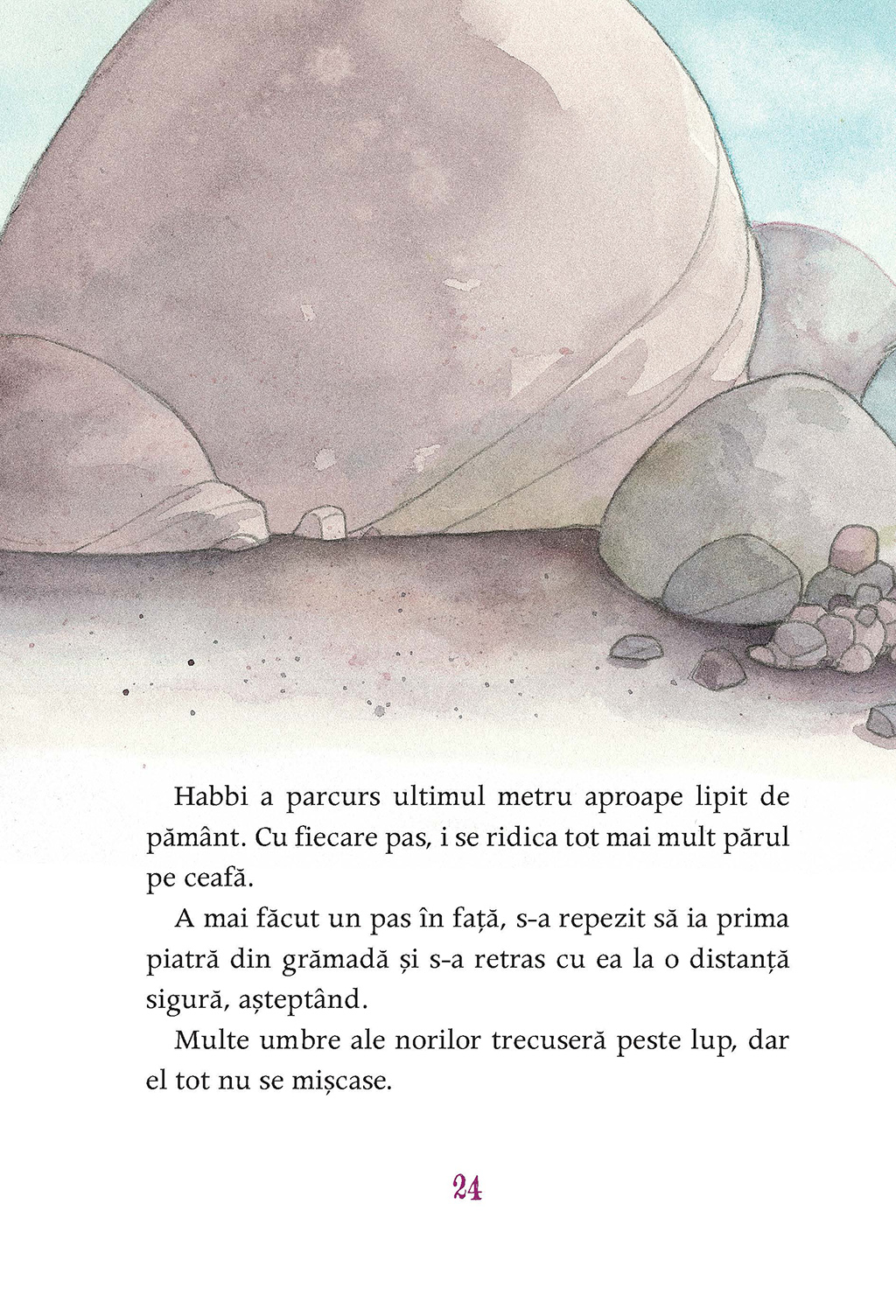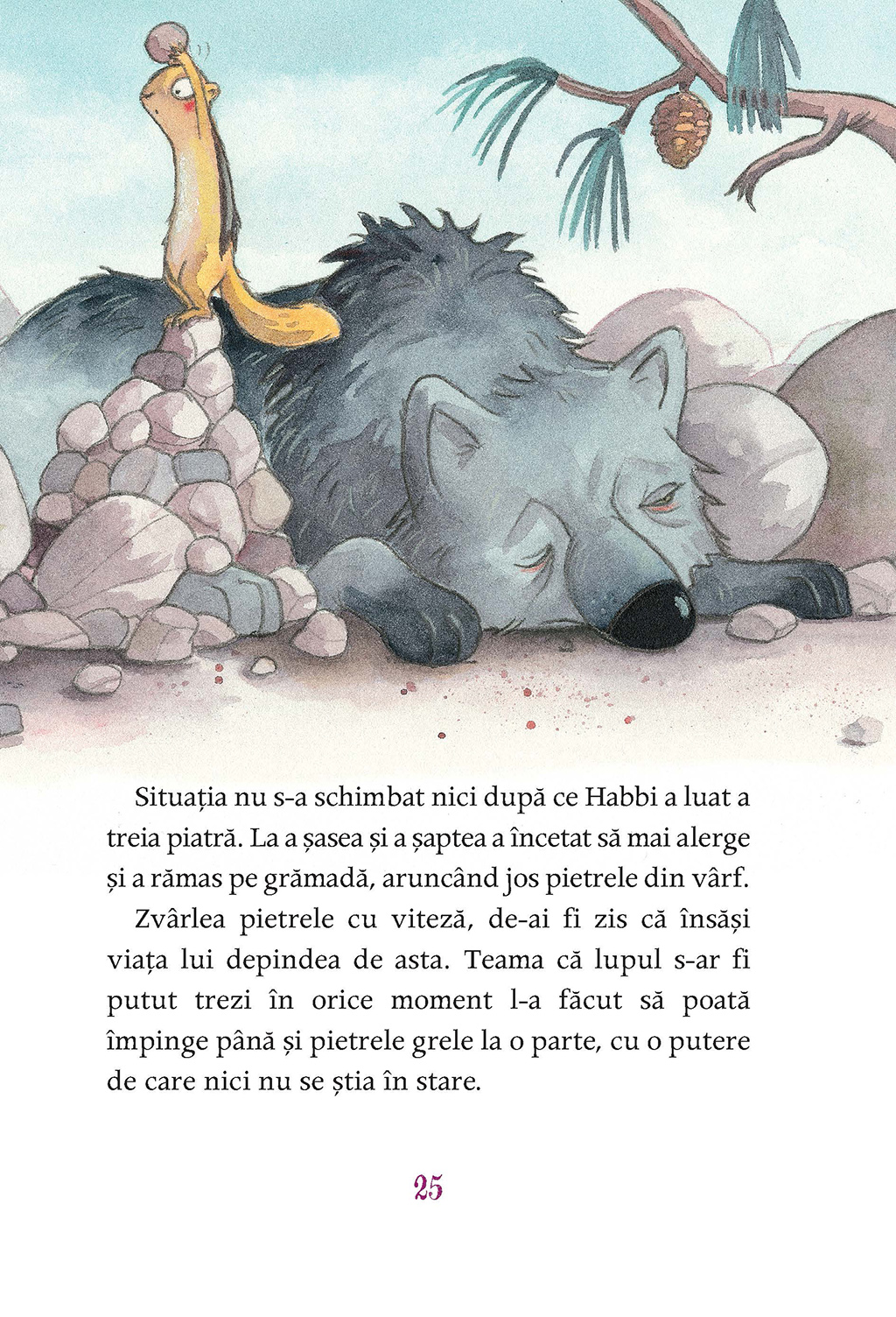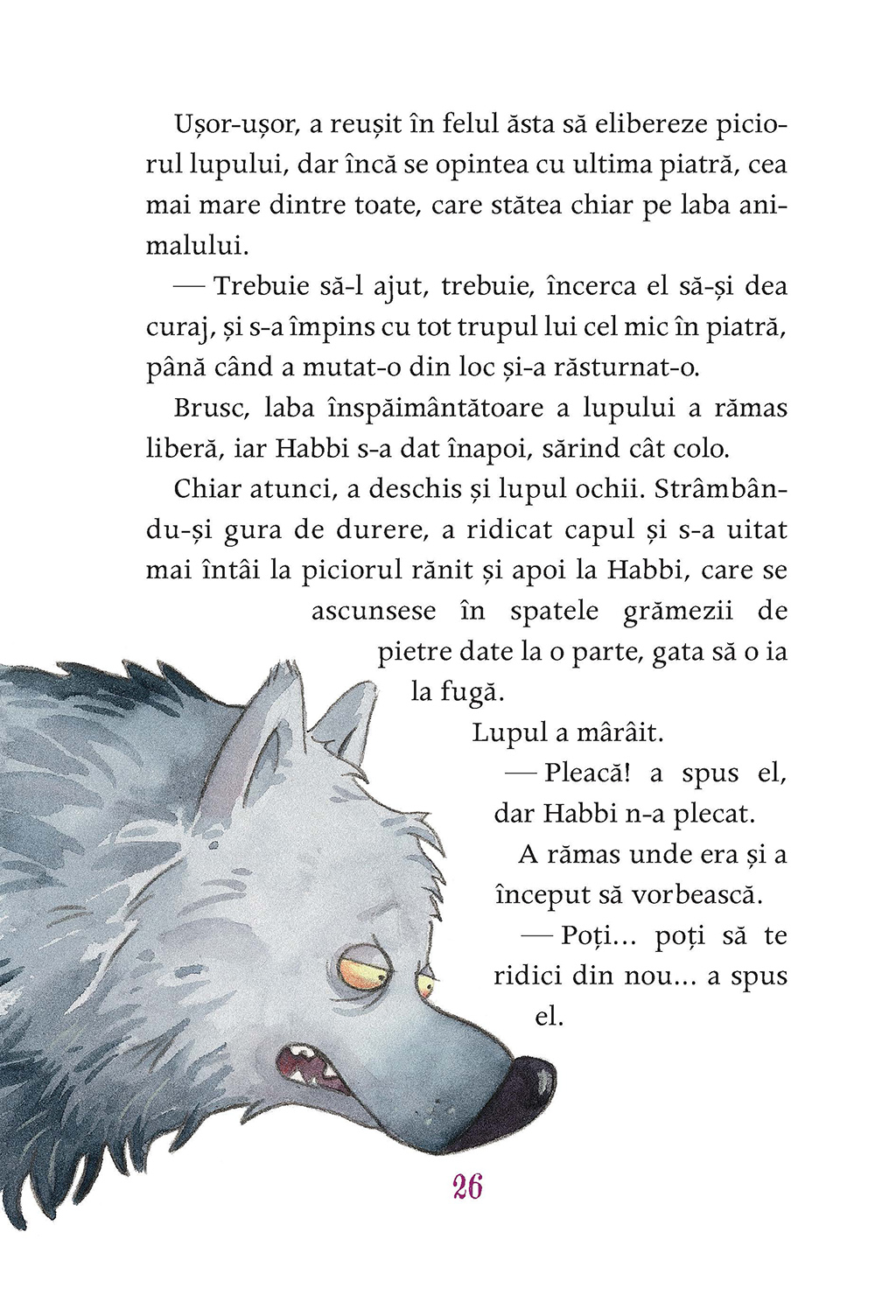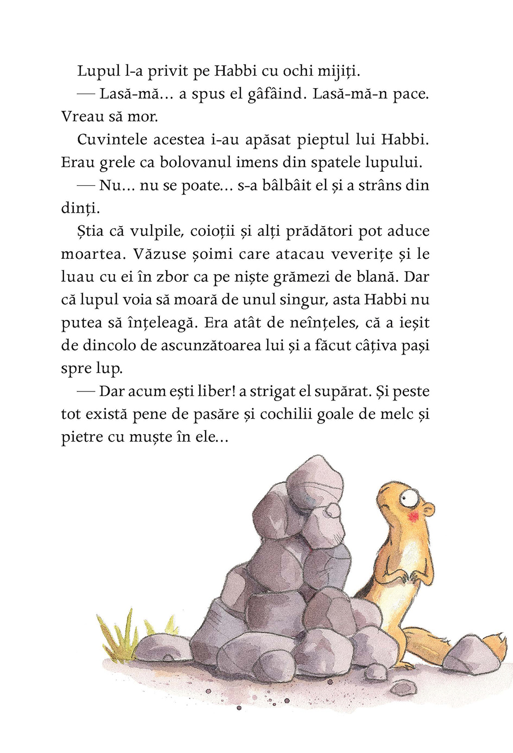 Se aventurează chiar şi-n locurile de care mama l-a avertizat să nu se-apropie. Pînă cînd, într-o zi, dă nas în nas cu lupul. Mare, gri, fioros, duşman de temut al veveriţelor. Dar stă nemişcat. Oare o fi rănit? În culcuşul său, Habbi se tot frămîntă: nu-l poate lăsa pe lup neajutorat.