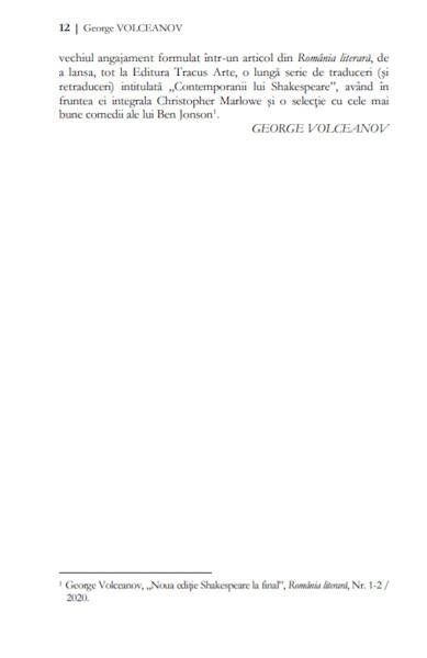 Sunt convins că noua ediție, cu programul și intențiile ei de redare a marii opere într-un registru lingvistic autentic, natural și firesc – cum a fost și gândită și jucată în vremea lui –, poate resuscita interesul și pasiunea pentru opera celui mai mare dramaturg al literaturii universale. (…) Toate traducerile sunt noi, la efortul și intenția editorului de a primeni limba în care apar textile lui W.S. alăturându-se câțiva scriitori, poeți și eseiști, care au reușit să țină sus o ștachetă a prospețimii și autenticității unei limbi române vii și colorate, precum engleza vorbită acum câteva secole. Unele texte apar pentru prima dată, dar toate beneficiază de studii critice aplicate, erudite și bine articulate sub aspect documentar.