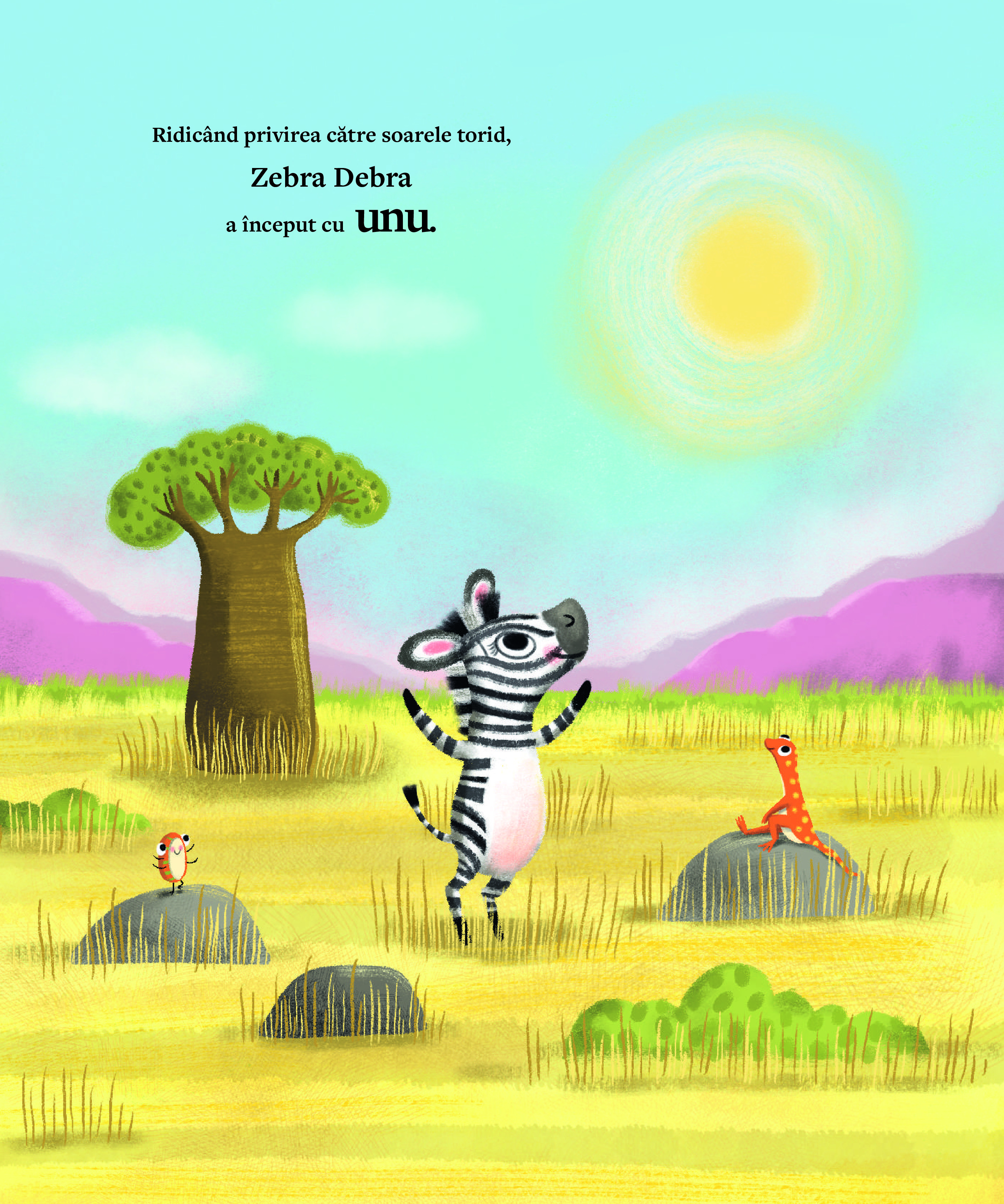 Zebra Debra este cât se poate de fericită că învață singură să numere. Dar – dezastru! - rămâne fără numere. Atunci înțeleapta ei mamă îi sare în ajutor. În timp ce hoinăresc prin savana africană, găsesc peste un milion de lucruri de numărat, înainte ca mama să îi spună Debrei că uneori cel mai bun număr dintre toate este unu. Până la urmă, tu esti unic(ă)!