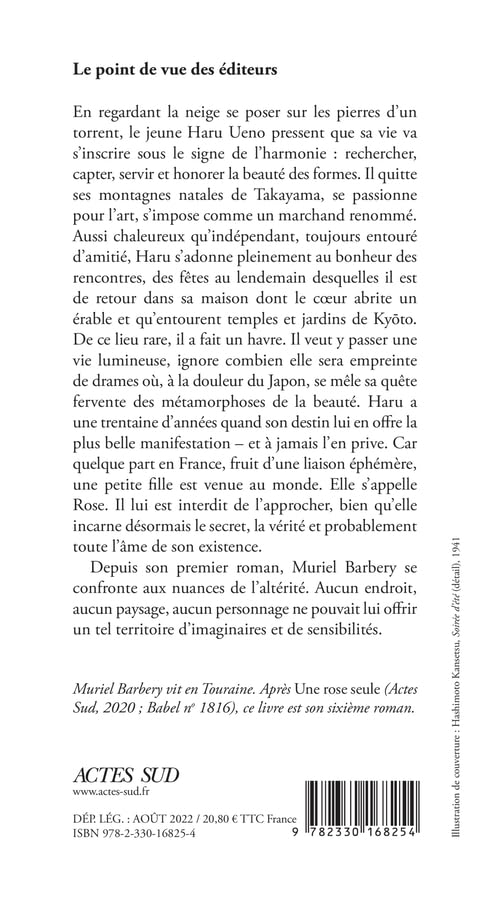 De ce lieu rare, il a fait un havre. Il veut y pas­ser une vie lumineuse, ignore combien elle sera empreinte de drames où, à la douleur du Japon, se mêle sa quête fervente des métamorphoses de la beauté. Haru a une trentaine d'années quand son destin lui en offre la plus belle manifestation - et à jamais l'en prive. Car quelque part en France, fruit d'une liaison éphé­mère, une petite fille est venue au monde.