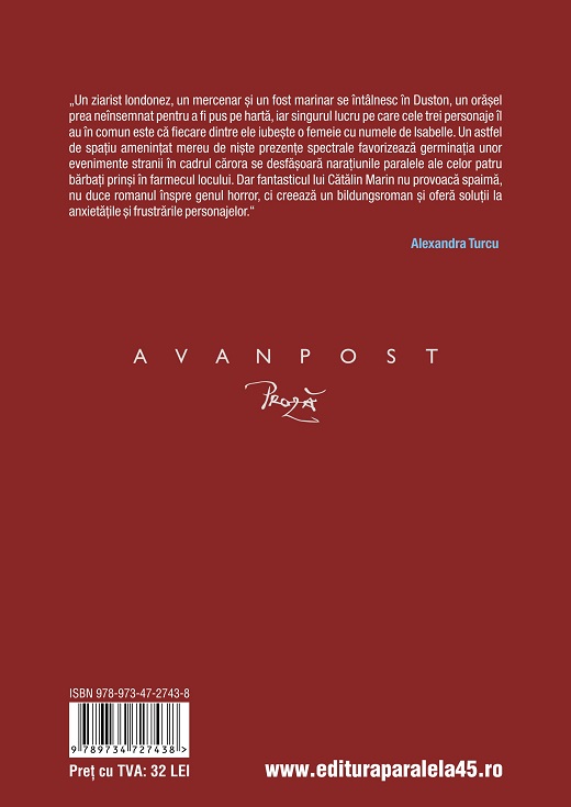"Un ziarist londonez, un mercenar și un fost marinar se întâlnesc în Duston, un orășel prea neînsemnat pentru a fi pus pe hartă, iar singurul lucru pe care cele trei personaje îl au în comun este că fiecare dintre ele iubește o femeie cu numele de Isabelle. Un astfel de spațiu amenințat mereu de niște prezențe spectrale favorizează germinația unor evenimente stranii în cadrul cărora se desfășoară narațiunile paralele ale celor patru bărbați prinși în farmecul locului. Dar fantasticul lui Cătălin Marin nu provoacă spaimă, nu duce romanul înspre genul horror, ci creează un bildungsroman și oferă soluții la anxietățile și frustrările personajelor.“