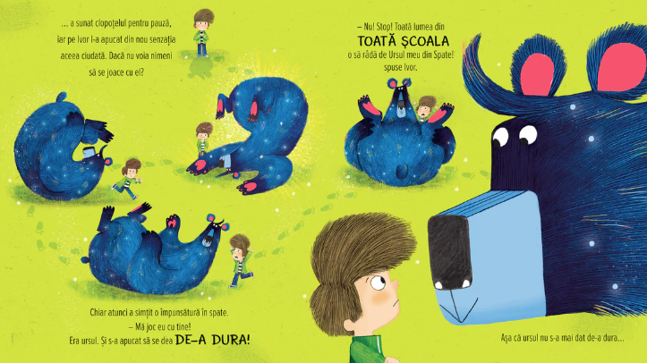 Iar când ursul deloc ursuz începe să provoace haos şi dezastre, speranţa lui Ivor de a avea o primă zi de şcoală normală se risipeşte rapid... O poveste ilustrată de neuitat, care stârneşte hohote de râs, de la Sam Copeland şi Pippa Curnick.