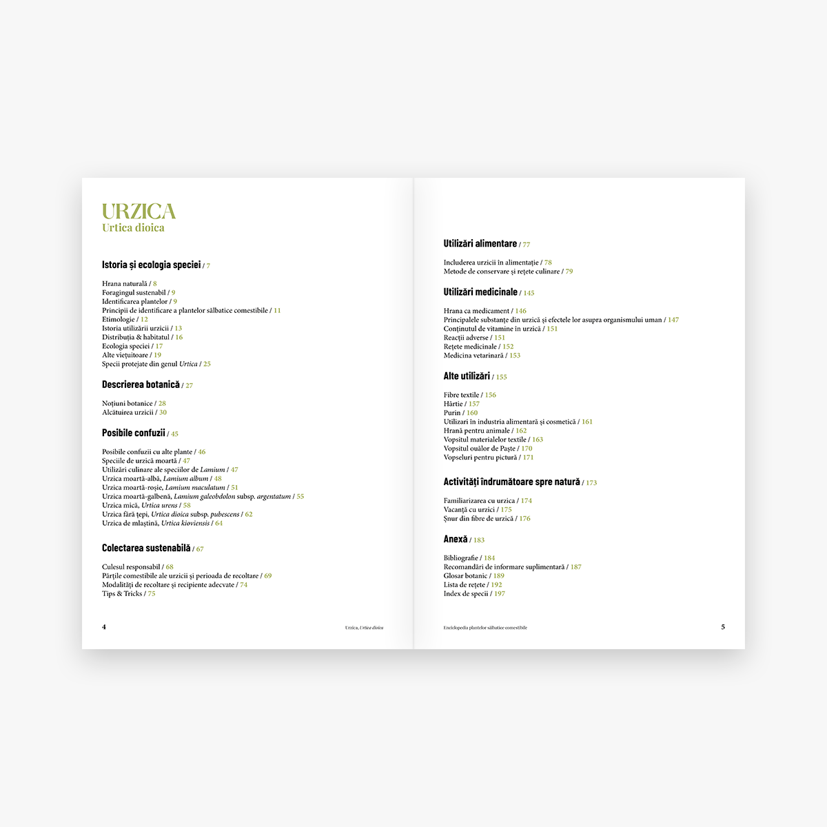 Volumul cuprinde informații utile despre această specie, dar și despre o serie de alte plante sălbatice comestibile cu care se aseamănă și care o însoțesc frecvent. De asemenea, sunt prezentate o serie de rețete culinare și informații despre proprietățile medicinale ale urzicii.