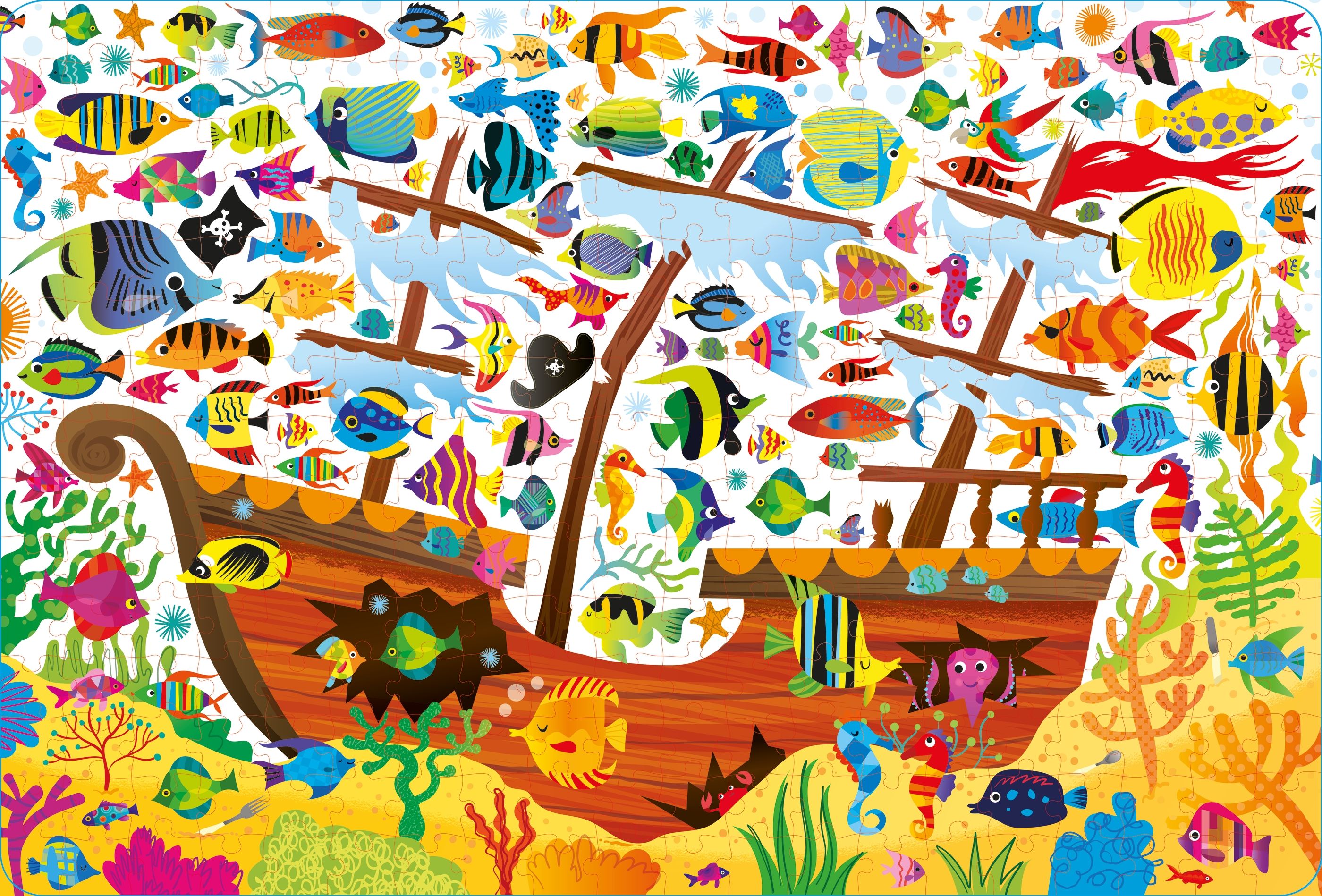 A fabulous 300-piece jigsaw teeming with colourful fish and a picture puzzle book, presented together in a beautiful sturdy box and both packed with things to spot and talk about.