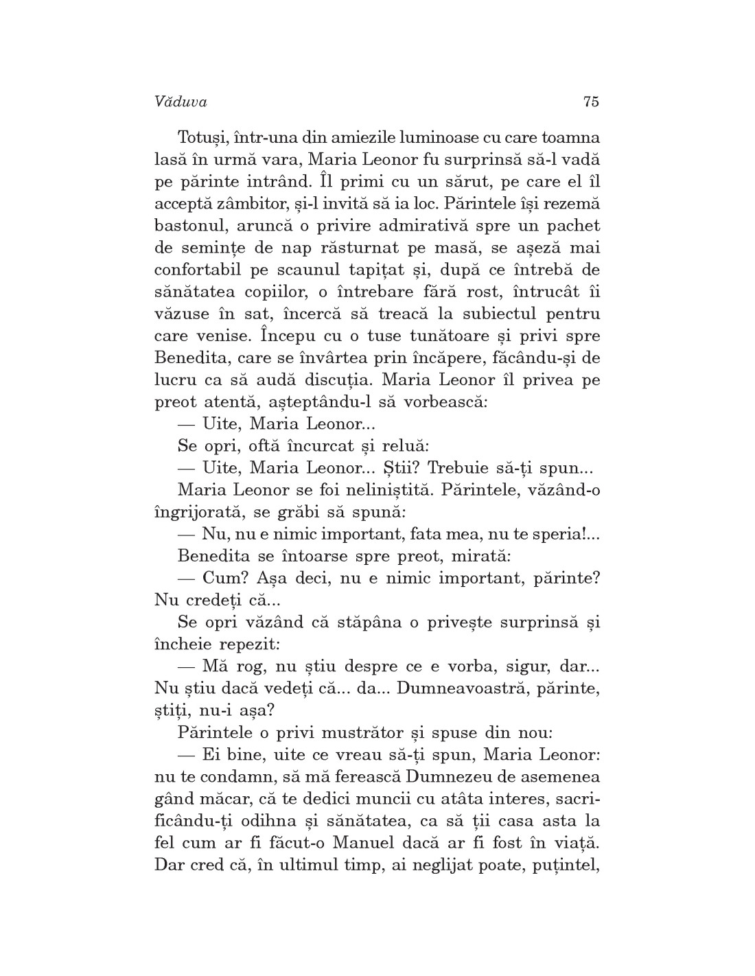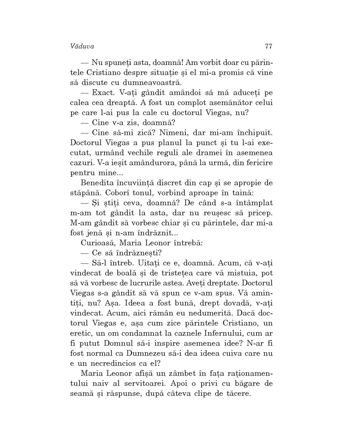 După moartea soţului, Maria Leonor, tânără mamă a doi copii, e copleşită de greutăţile administrării fermei ei din Ribatejo, de aşteptările societăţii şi de faptul că e supravegheată neîncetat de servitoarea ei. După câteva luni petrecute într-o depresie adâncă, se hotărăşte să-şi asume rolul de stăpână a moşiei, dar suferă în continuare, prinsă între tristeţea doliului şi dorinţa sexuală. Reflectând la esenţa iubirii, la trecerea timpului şi schimbările din natură, tânăra văduvă îşi petrece nopţile trează, pândind aventurile servitoarelor ei şi suferind de singurătate, până când doi bărbaţi foarte diferiţi se amestecă în viaţa ei, care ia o turnură periculoasă. Romanul Văduva, scris de tânărul Saramago, lasă să se întrevadă autorul colosal pe care îl cunoaştem. Modul lui unic de-a privi lumea şi unele particularităţi ale celor mai lăudate cărţi ale sale sunt deja vizibile în acest prim roman.
