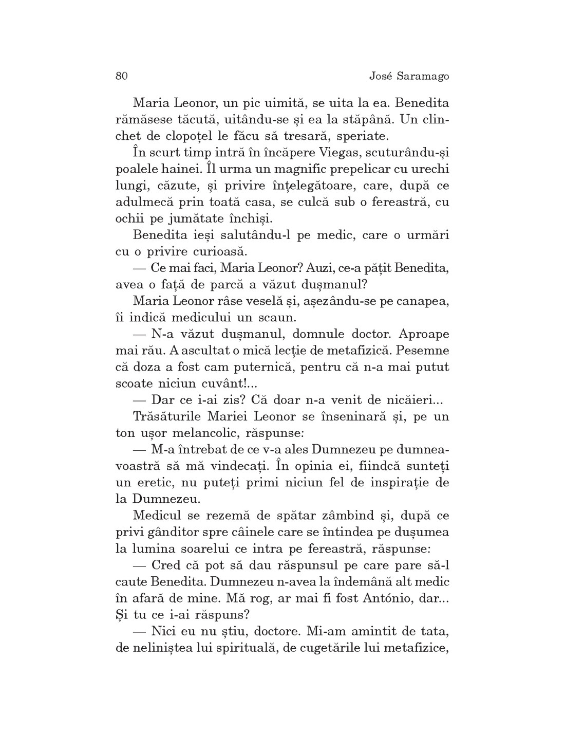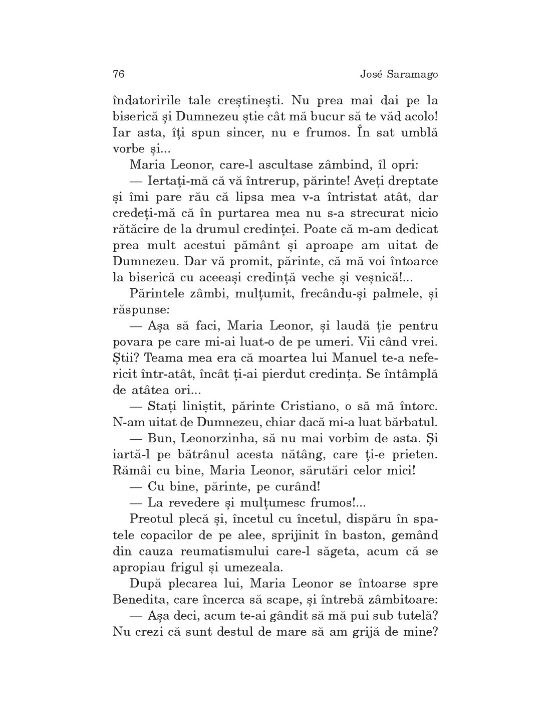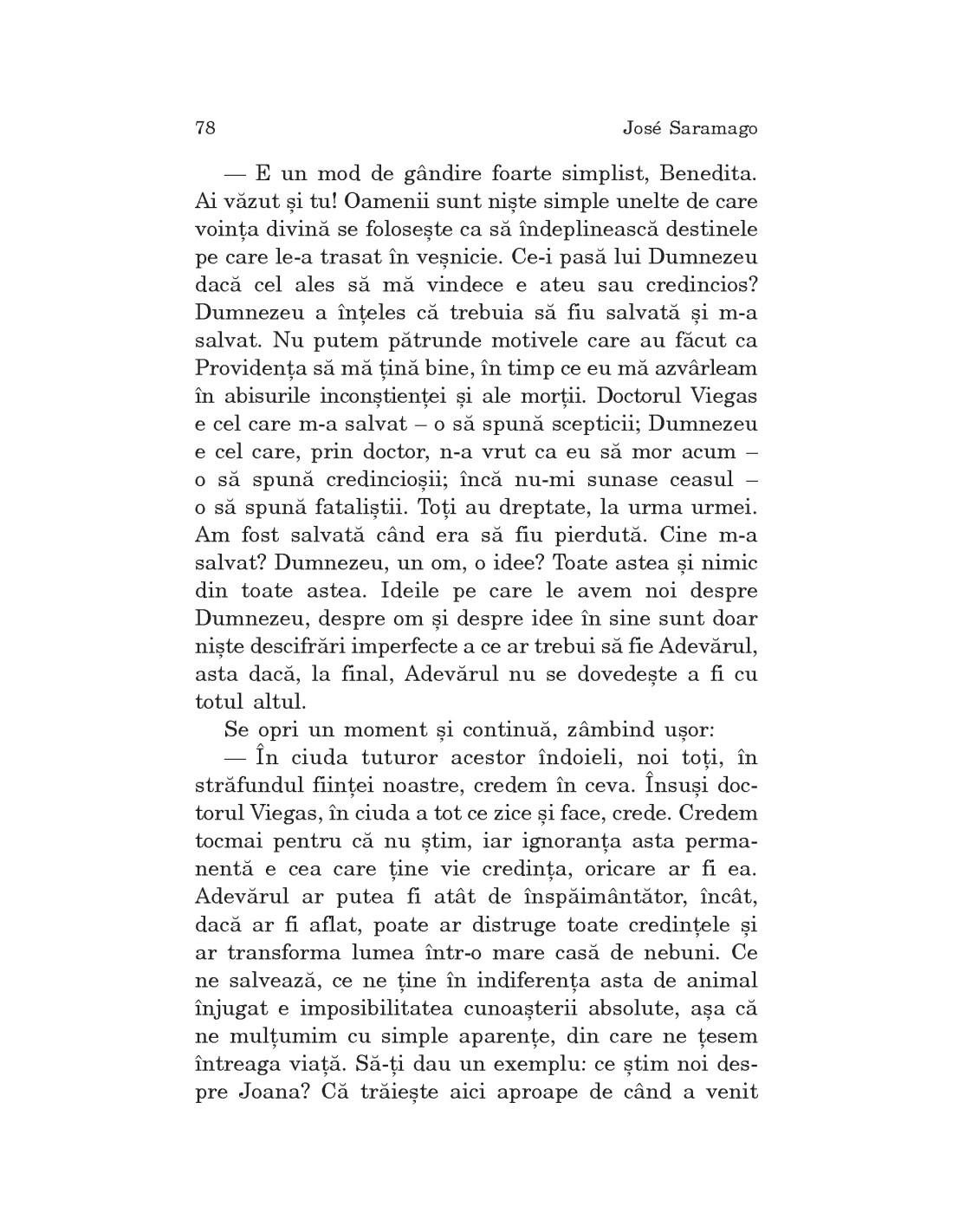 „A trăi, ți-am mai spus, e o operațiune simplă, pe care societatea, convențiile, răutatea oamenilor o complică zilnic cu emoții, sentimente, neplăceri, speranțe, deziluzii și tristeți. [...] Dar ne rămâne mângâierea că, de multe ori, din tristețile noastre se nasc bucuriile celorlalți.” (José Saramago)