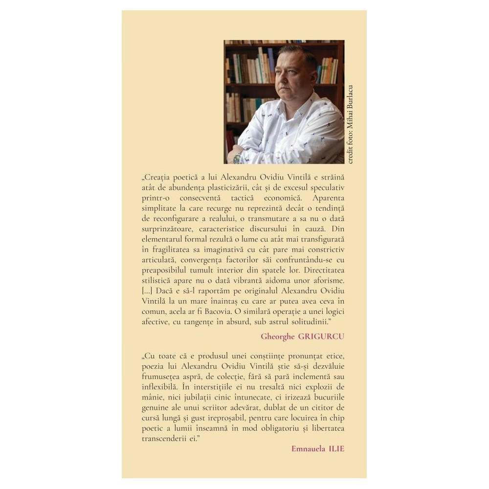 „Poetul stă în bibliotecă și străbate toate lumile, văzute sau nu, posibile sau doar presimțite. Nu are complexul irealității, care foșnește între coperțile cărților, cum nu se lasă decisiv sedus de realul care, transmutat simbolic, dă buzna prin fereastra deschisă. Volumul Valiza de lemn, semnat de Alexandru Ovidiu Vintilă, mă duce cu gândul la mișcarea americană Deep Image Poetry, la acea poezie a imaginii profunde, în care imaginea (vizuală, senzorială, intuitivă) devine centrul exprimării poetice. Nu explicaţia raţională, ci imaginea evocatoare este cea care transmite emoţia. Într-o lume a demitizărilor agresive, care par să izoleze ființa umană tot mai fragilizată, poetul vine cu mitologia personală, ca o soluție pentru cititorul care se simte captiv între orizonturi. Poezia lui Alexandru Ovidiu Vintilă, din Valiza de lemn, este o demonstrație făcută cu mult talent despre cum verbul poetic se opune artificializării lumii și istoriei, refuzului iubirii și înstrăinării ființei în care mai pâlpâie ceva din scânteia divină.”