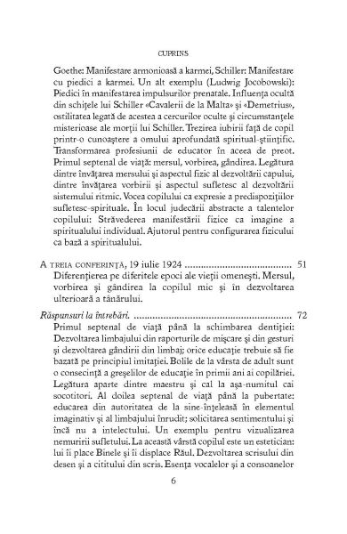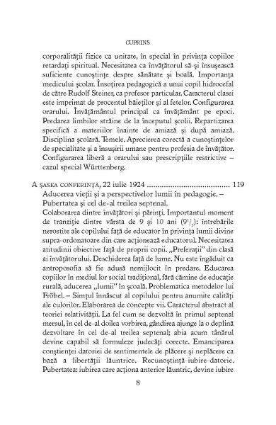 Pe această bază, Steiner prezintă înțelegerea sa asupra fiecărui aspect al dezvoltării copilului – corporal, psihologic și spiritual. În același timp, el arată că, pentru a se dovedi demni de chemarea lor, profesorii trebuie să înceapă un proces de dezvoltare interioară. În viziunea lui Steiner, ființele umane sunt cele care dau valoare și sens lumii.