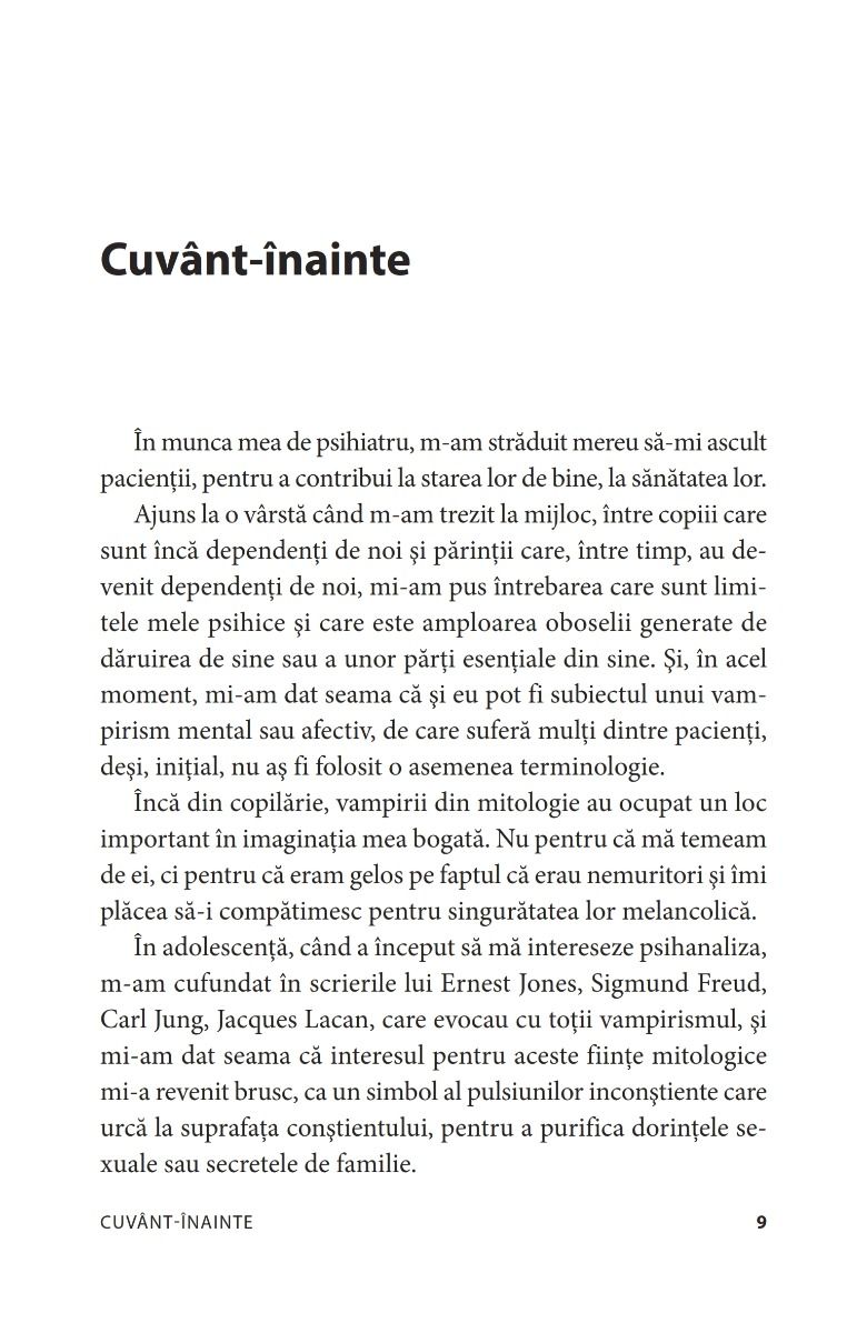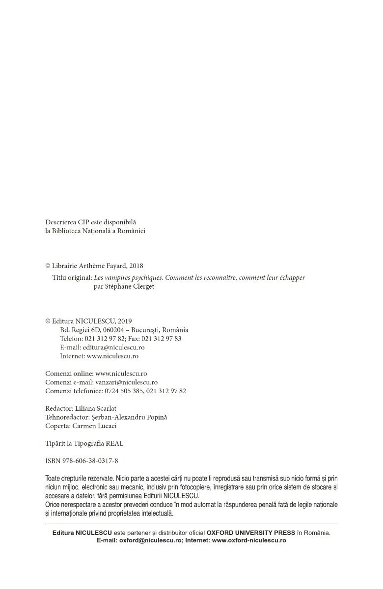 Şi cum ei pot să adopte înfăţişări şi personalităţi foarte diverse, ceea ce face dificilă identificarea lor imediată, din această carte veţi învăţa cum să-i reperaţi, să-i înţelegeţi, să vă protejaţi, dar şi cum să vă daţi seama că puteţi fi voi înşivă un vampir psihic.