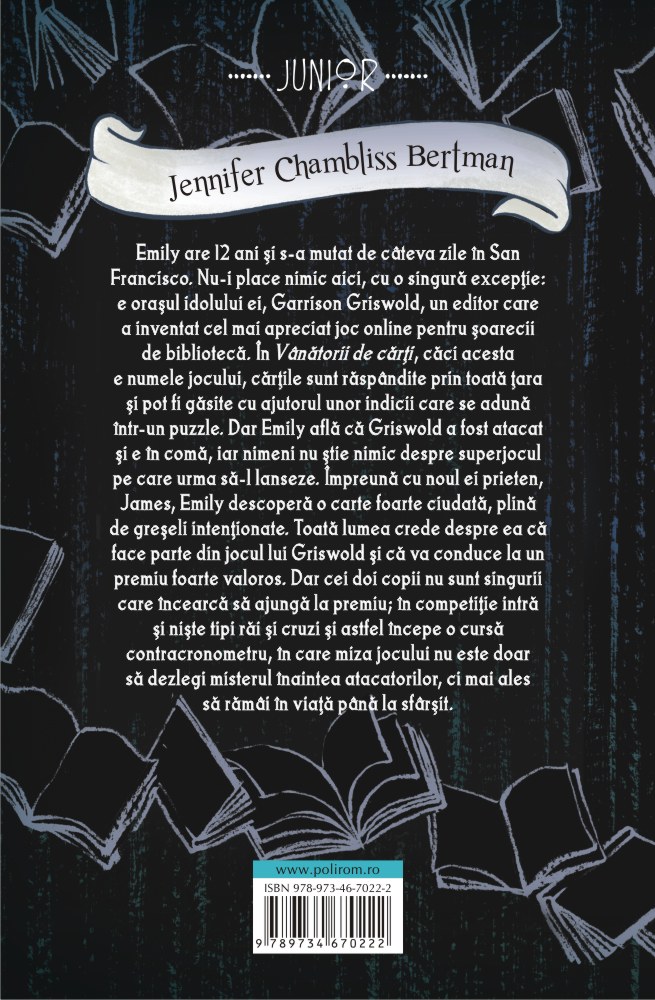 Emily are 12 ani şi s-a mutat de cîteva zile în San Francisco. Nu-i place nimic aici, cu o singură excepţie: e oraşul idolului ei, Garrison Griswold, un editor care a inventat cel mai apreciat joc online pentru şoarecii de bibliotecă. În Vînătorii de cărţi, căci acesta e numele jocului, cărţile sînt răspîndite prin toată ţara şi pot fi găsite cu ajutorul unor indicii care se adună într-un puzzle. Dar Emily află că Griswold a fost atacat şi e în comă, iar nimeni nu ştie nimic despre superjocul pe care urma să-l lanseze. Împreună cu noul ei prieten, James, Emily descoperă o carte foarte ciudată, plină de greşeli intenţionate. Toată lumea crede despre ea că face parte din jocul lui Griswold şi că va conduce la un premiu foarte valoros. Dar cei doi copii nu sînt singurii care încearcă să ajungă la premiu; în competiţie intră şi nişte tipi răi şi cruzi şi astfel începe o cursă contracronometru, în care miza jocului nu este doar să dezlegi misterul înaintea atacatorilor, ci mai ales să rămîi în viaţă pînă la sfîrşit.