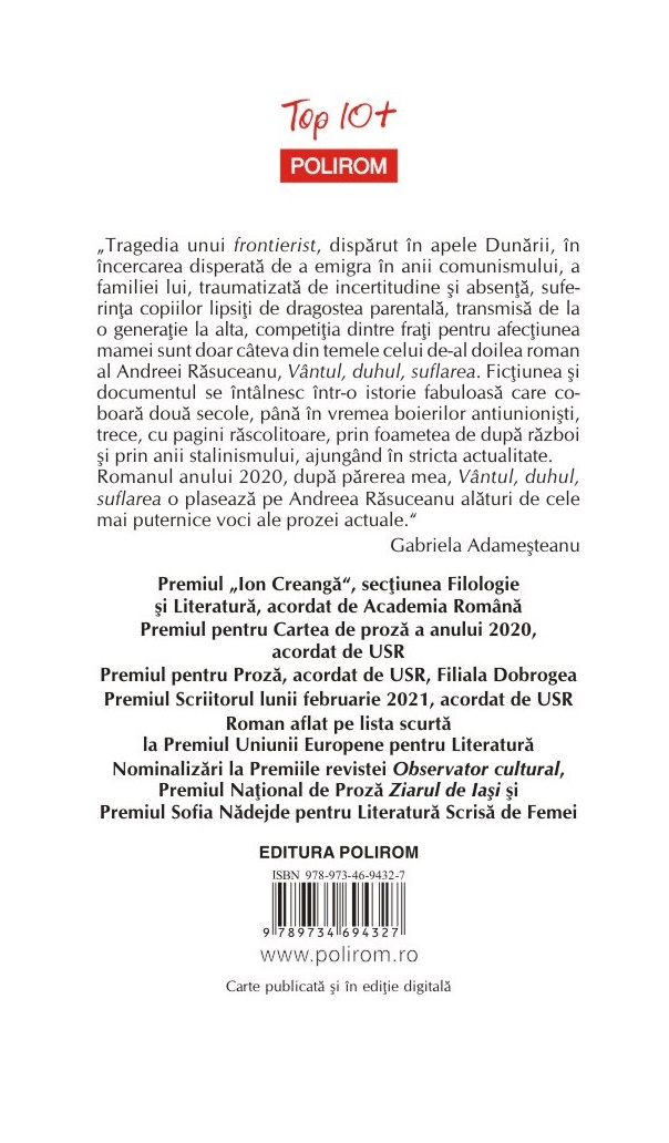 Romanul anului 2020, după părerea mea, Vântul, duhul, suflarea o plasează pe Andreea Răsuceanu alături de cele mai puternice voci ale prozei actuale.” (Gabriela Adameşteanu)
