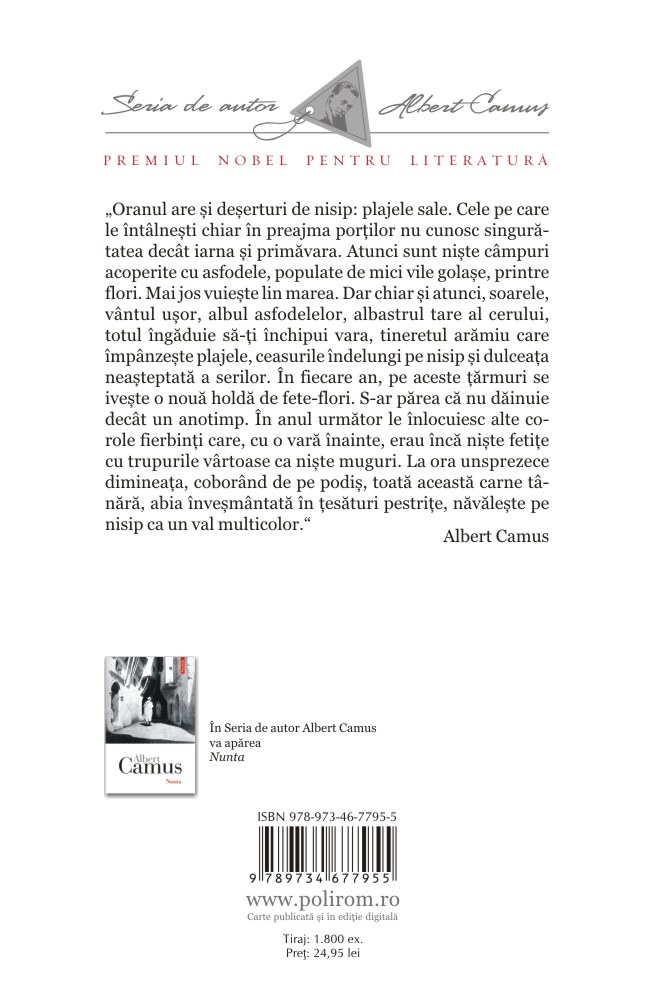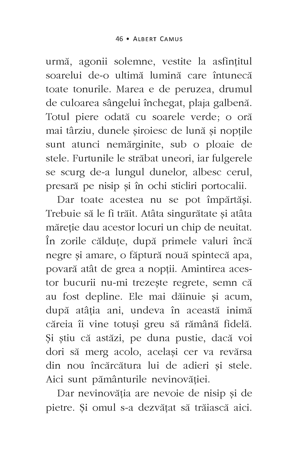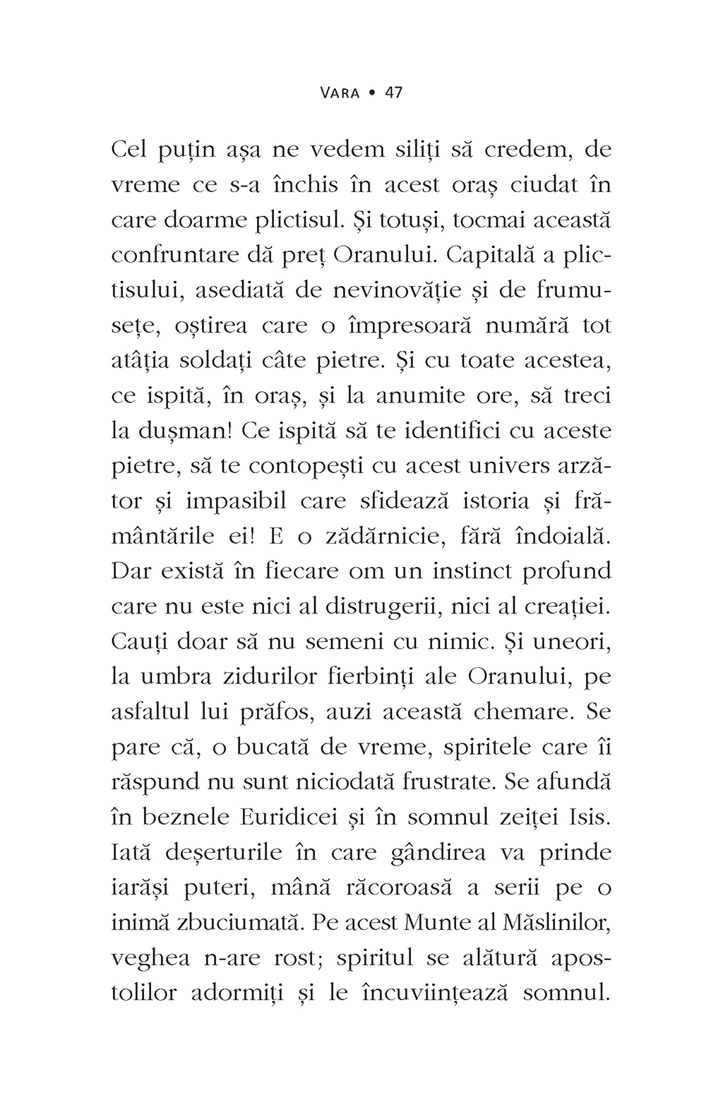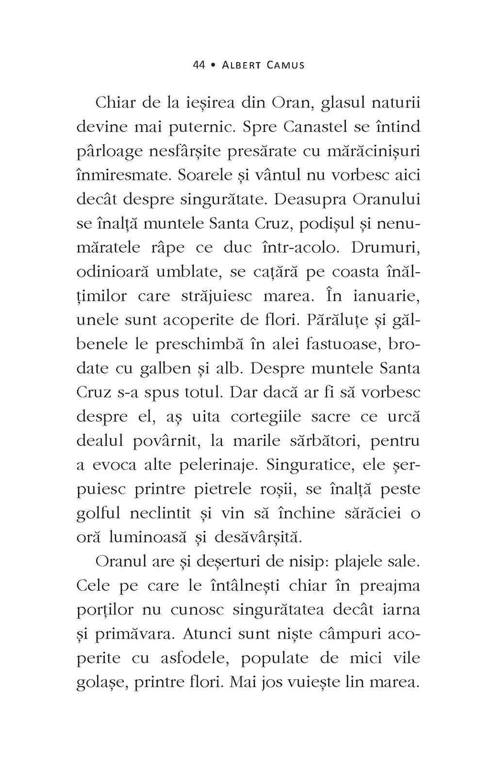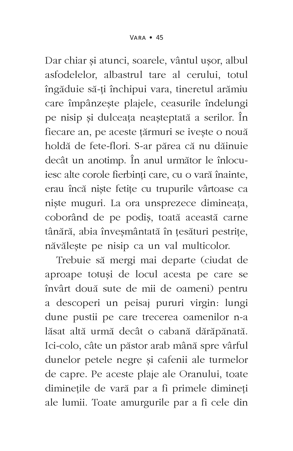 „Oranul are și deșerturi de nisip: plajele sale. Cele pe care le întîlnești chiar în preajma porților nu cunosc singurătatea decît iarna și primăvara. Atunci sînt niște cîmpuri acoperite cu asfodele, populate de mici vile golașe, printre flori. Mai jos vuiește lin marea. Dar chiar și atunci, soarele, vîntul ușor, albul asfodelelor, albastrul tare al cerului, totul îngăduie să‑ți închipui vara, tineretul arămiu care împînzește plajele, ceasurile îndelungi pe nisip și dulceața neașteptată a serilor. În fiecare an, pe aceste țărmuri se ivește o nouă holdă de fete‑flori. S‑ar părea că nu dăinuie decît un anotimp. În anul următor le înlocuiesc alte corole fierbinți care, cu o vară înainte, erau încă niște fetițe cu trupurile vîrtoase ca niște muguri. La ora unsprezece dimineața, coborînd de pe podiș, toată această carne tînără, abia înveșmîntată în țesături pestrițe, năvălește pe nisip ca un val multicolor.” (Albert Camus)