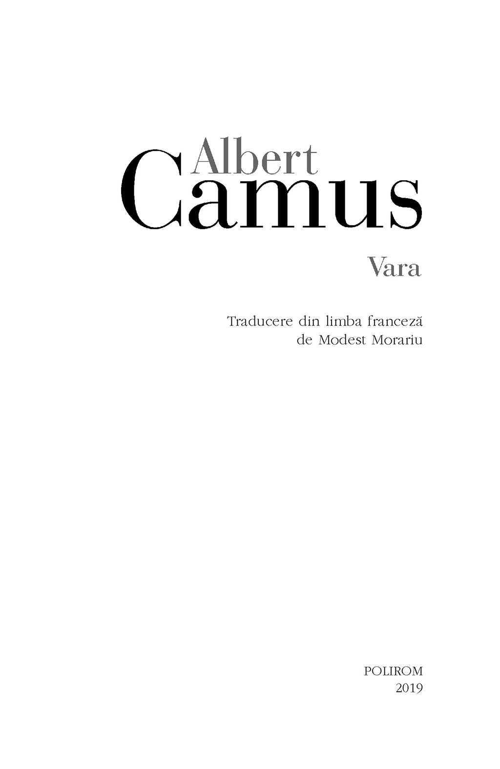 Vara (1954) aduce laolaltă cîteva proze aparent eterogene, scrise între 1939 și 1953, ce ilustrează cu subtilitate uneori ironică și lirism încîntător „soarele și umbra sufletului mediteraneean”. Fie că merge pe urmele Minotaurului prin labirintul de piatră încinsă al Oranului natal, fie că revede mitul lui Prometeu prin ochii lumii moderne împăcate cu propriile păcate sau că meditează la frumusețe, a cărei expresie desăvîrșită este Elena din Troia, Camus ne poartă într-o călătorie uimitoare prin spațiul mediteraneean și prin universul legendelor sale.