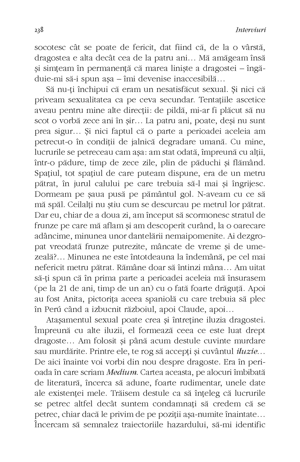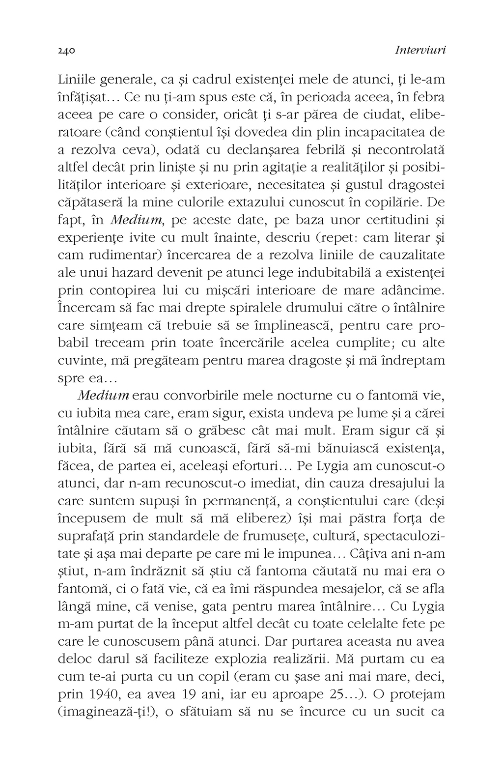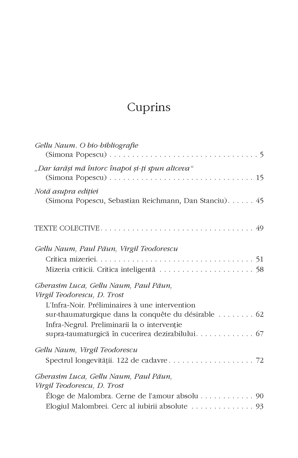 „În acest volum final al Operelor se desfășoară în fața noastră un întreg parcurs literar și de viață: un tînăr poet suprarealist într-un grup de poeți suprarealiști, prin anii ’40, apoi un «individualist feroce», cineva pentru care suprarealismul nu (mai) e legat de un timp anume, ci destin. Și-l «vedem» scriindu-le Lygiei, jumătatea lui, și prietenilor, îl «auzim» răspunzînd unor întrebări, el însuși fiind propriul său «întrebător», stînd de vorbă cu alții sau cu el însuși prin alții, cum spunea uneori. Așadar, texte scrise de Gellu Naum în colaborare cu prietenii săi, adresate lor, interviuri, scrisori, discursuri. Cu o sintagmă care-i aparține, tot ce s-a strîns aici se adaugă la «completarea labirintului».” (Simona Popescu)