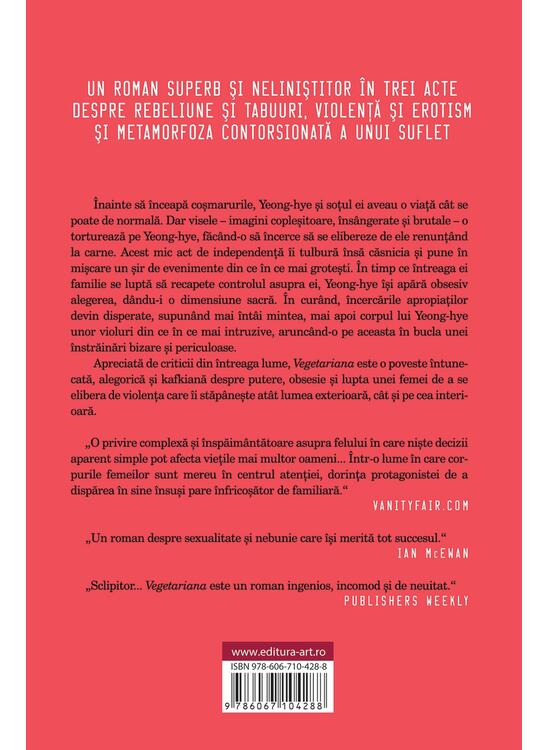 Apreciată de criticii din întreaga lume, Vegetariana este o poveste întunecată, alegorică şi kafkiană despre putere, obsesie şi lupta unei femei de a se elibera de violenţa care îi stăpâneşte atât lumea exterioară, cât şi pe cea interioară.