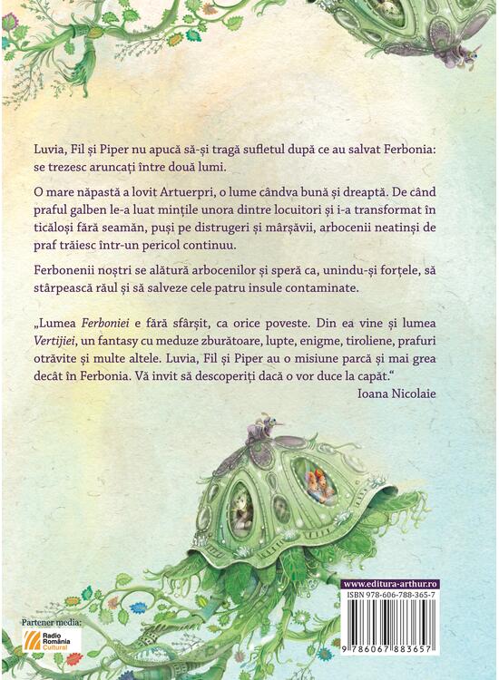 „Lumea Ferboniei e fără sfârșit, ca orice poveste. Din ea vine și lumea Vertijiei, un fantasy cu meduze zburătoare, lupte, enigme, tiroliene, prafuri otrăvite și multe altele. Luvia, Fil și Piper au o misiune parcă și mai grea decât în Ferbonia. Vă invit să descoperiți dacă o vor duce la capăt.“ - Ioana Nicolaie