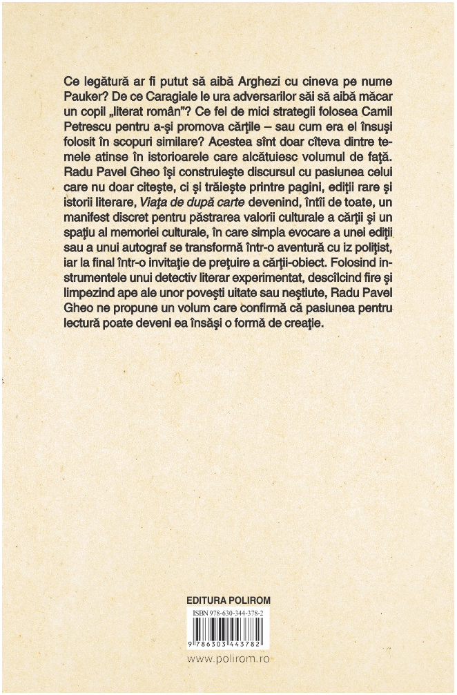 Radu Pavel Gheo își construiește discursul cu pasiunea celui care nu doar citește, ci și trăiește printre pagini, ediții rare și istorii literare, Viața de după carte devenind, întâi de toate, un manifest discret pentru păstrarea valorii culturale a cărții și un spațiu al memoriei culturale, în care simpla evocare a unei ediții sau a unui autograf se transformă într-o aventură cu iz polițist, iar la final într-o invitație de prețuire a cărții-obiect.