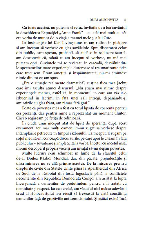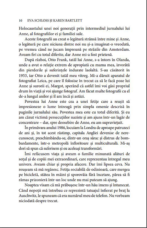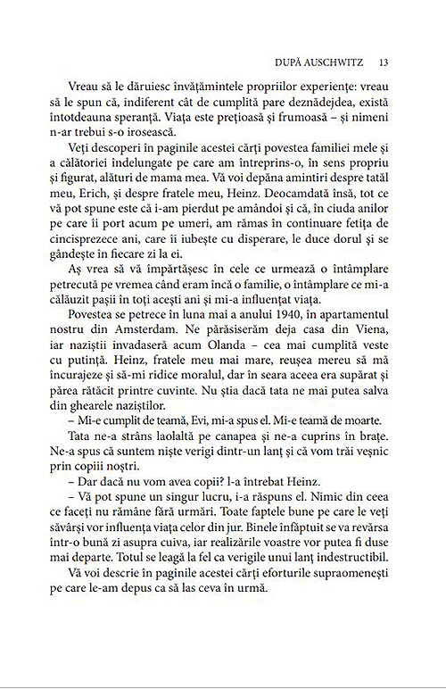 Viata dupa Auschwitz este o relatare uimitoare a vietii Evei Schloss, incepand cu anii de dinainte de cel de-al Doilea Razboi Mondial, continuand cu supravietuirea la Auschwitz si, mai tarziu, cu activitatea ei la Fundatia „Anne Franck“. Inainte de razboi, in Amsterdam, Eva se imprietenise cu o fetita, Anne Frank. Desi destinele lor au fost diferite, Anne fiind ucisa de nemti, Eva avea sa fie legata pentru tot restul vietii de ea, intrucat mama ei s-a casatorit cu tatal Annei. Dupa incheierea razboiului, Eva isi va reface viata, casatorindu-se si avand 3 copii, va avea propria afacere si se va dedica, alaturi de tatal vitreg, pastrarii memoriei Annei Frank. Va calatori in toata lumea si va face cunoscute ororile din lagarele de exterminare, indemnand lumea sa nu uite tragediile intamplate si sa-si pastreze speranta.