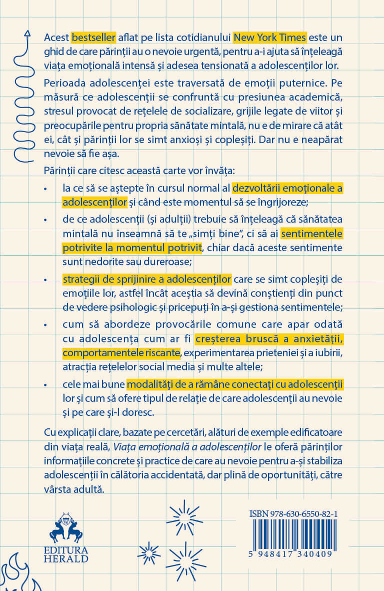 Acest bestseller aflat pe lista cotidianului New York Times este un ghid de care parintii au o nevoie urgenta, pentru a-i ajuta sa inteleaga viata emotionala intensa si adesea tensionata a adolescentilor lor. Perioada adolescentei este traversata de emotii puternice. Pe masura ce adolescentii se confrunta cu presiunea academica, stresul provocat de retelele de socializare, grijile legate de viitor si preocuparile pentru propria sanatate mintala, nu e de mirare ca atat ei, cat si parintii lor se simt anxiosi si coplesiti. Dar nu e neaparat nevoie sa fie asa.
